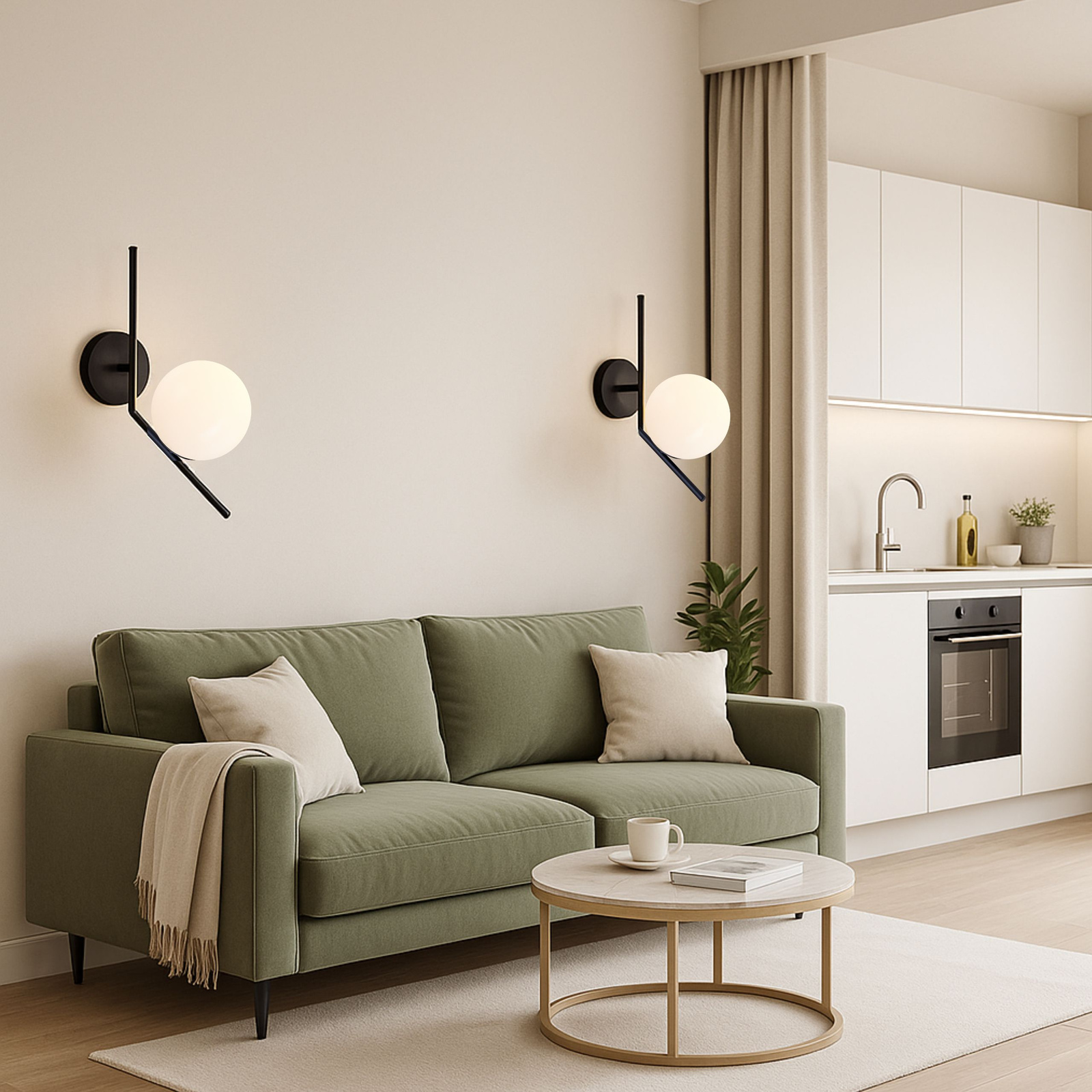 Ten kinkiet zgrabnie łączy surowy minimalizm - geometryczny kształt, proste linie, symetrię - z subtelnym luksusem w dobrym guście, którego wyrazem jest mocny, czarny kolor, a także mleczne, opalowe wykończenie okrągłego klosza.
