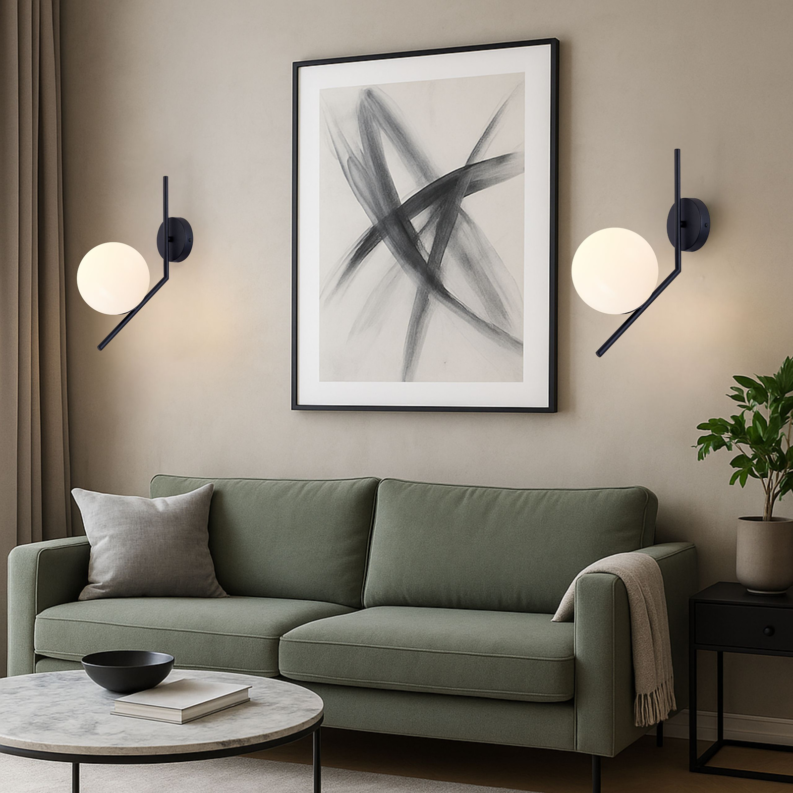 Lampa ścienna czarna metalowa z mlecznym kloszem ozdobna szklana kula E27 kinkiet design