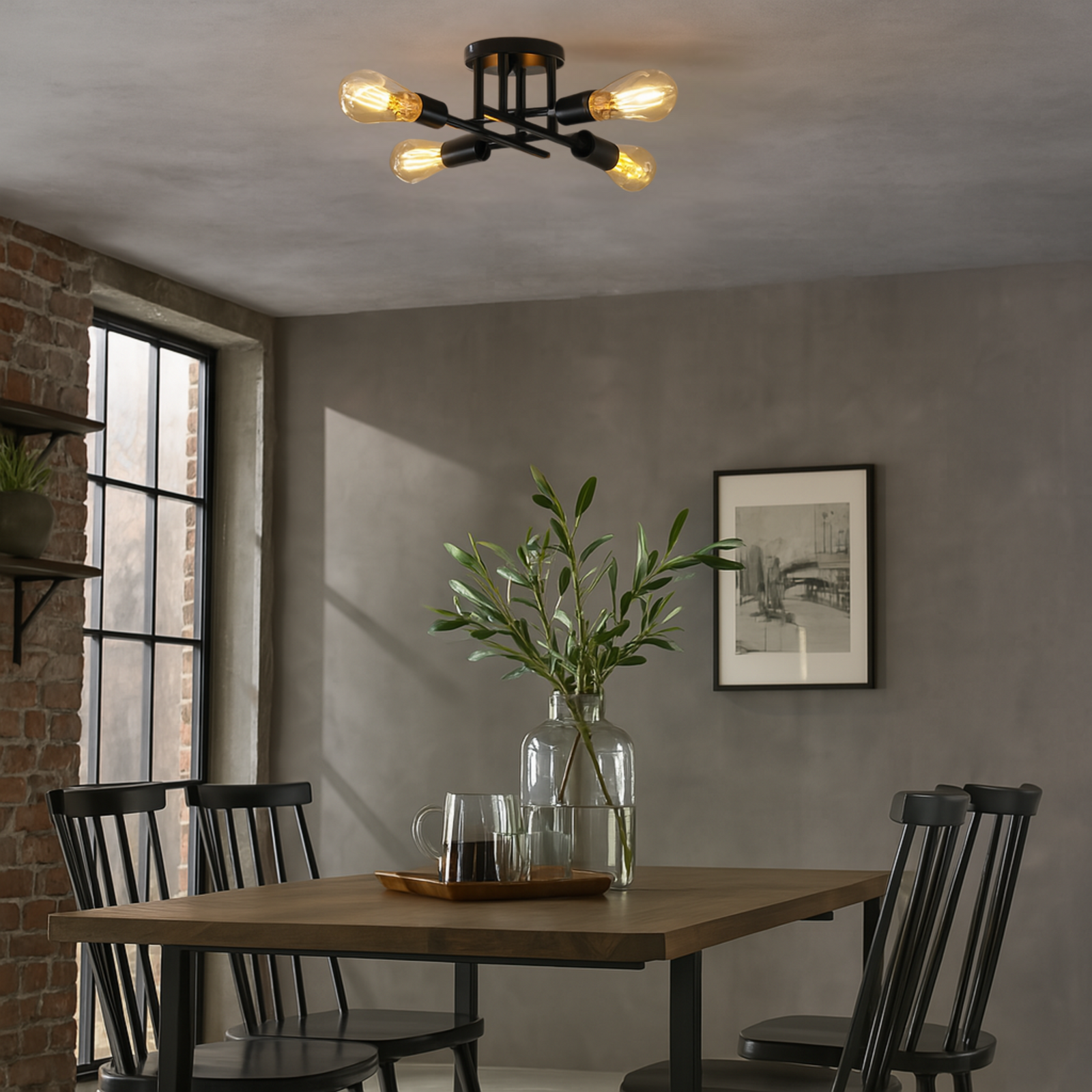 Czarne, metalowe ramiona o geometrycznym układzie tworzą efektowną kompozycję, która przyciąga uwagę i dodaje wnętrzu charakteru.