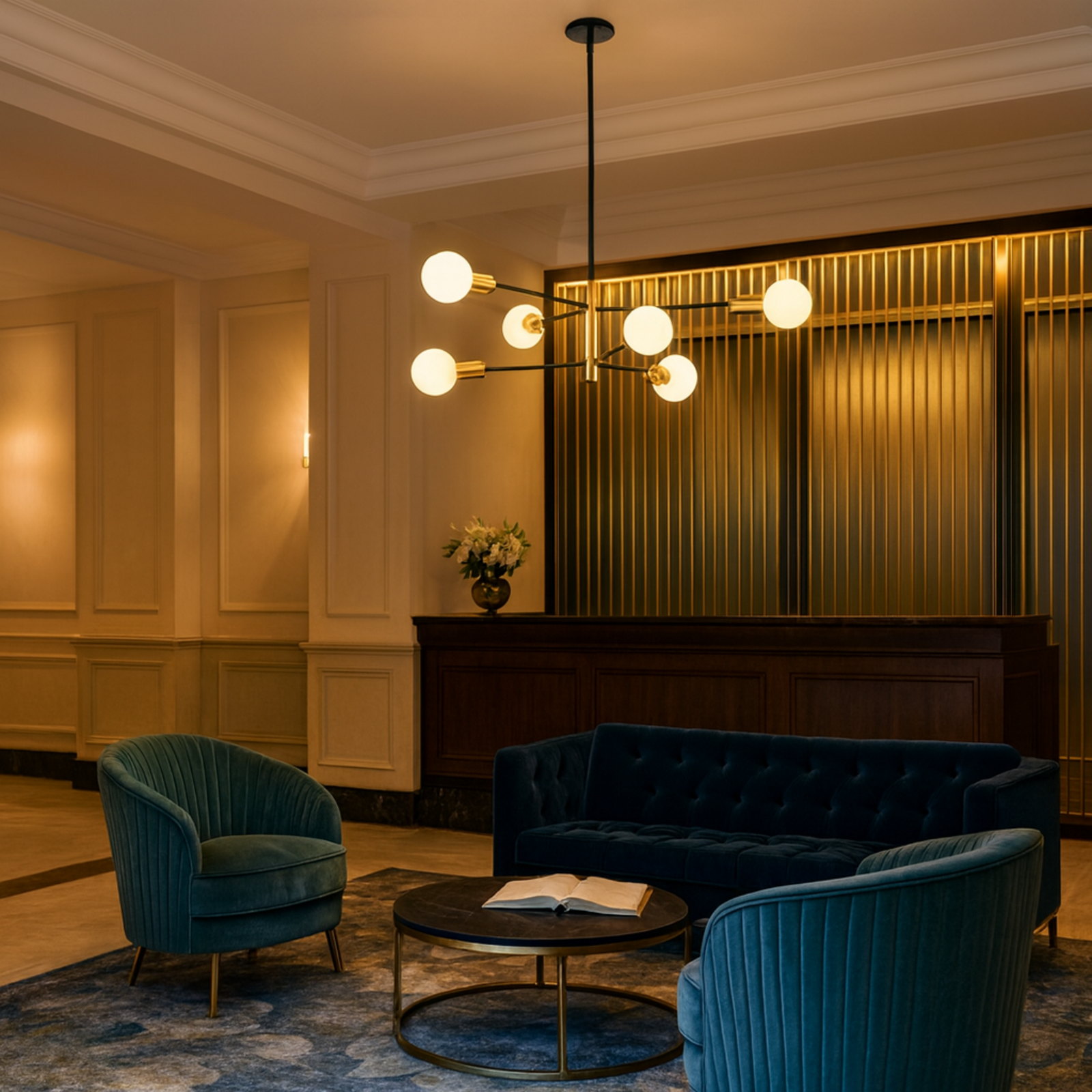 Geometryczna kompozycja sześciu źródeł światła pozwala na równomierne oświetlenie przestrzeni, tworząc nastrojową i wyrafinowaną atmosferę.