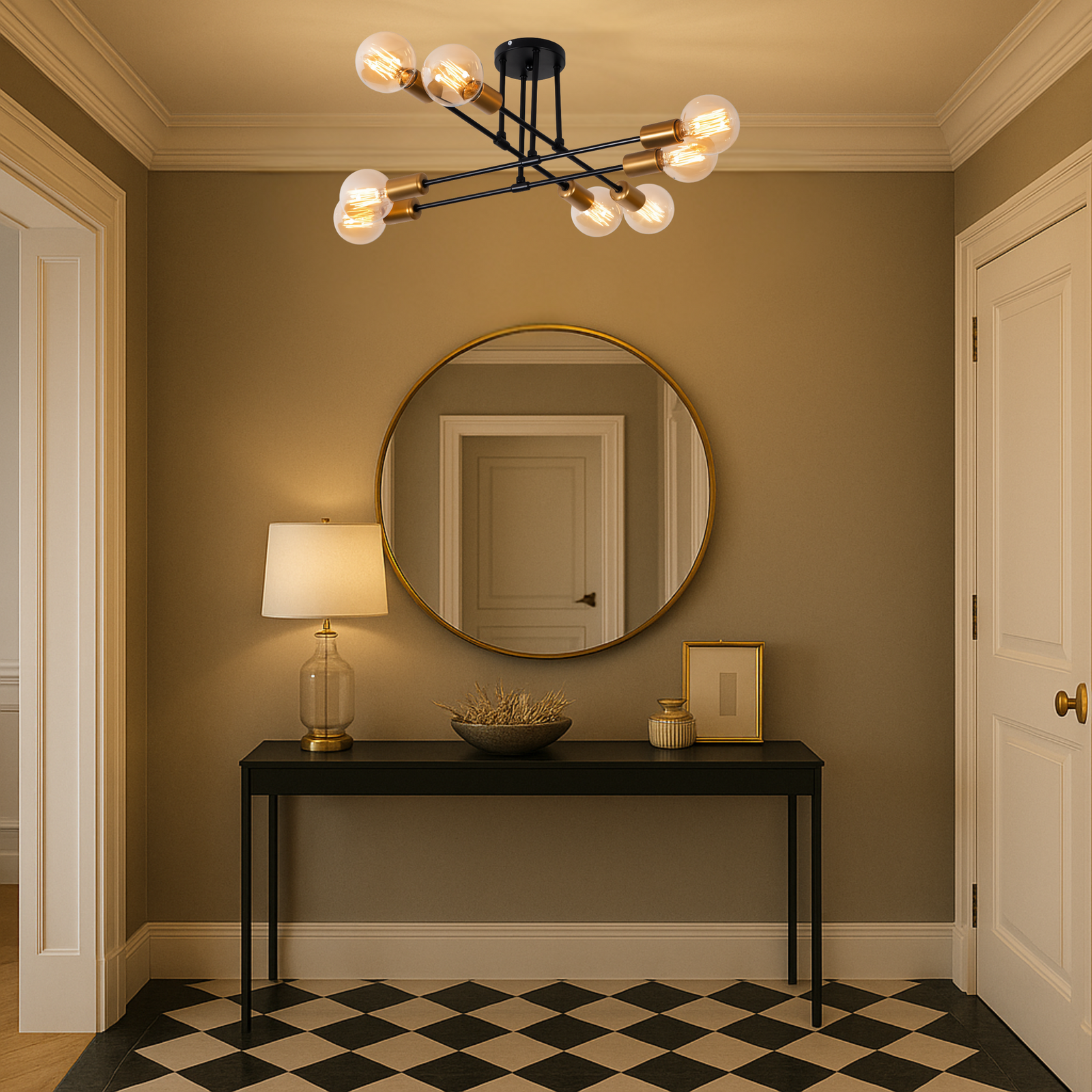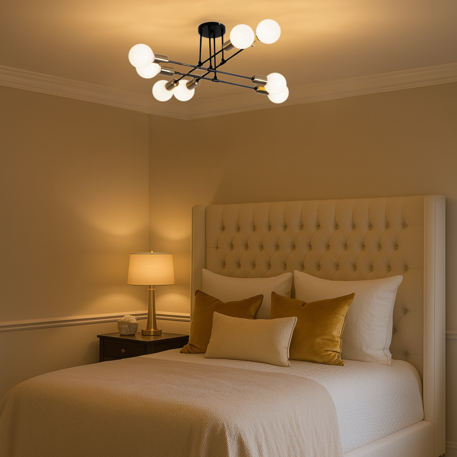Geometryczna kompozycja ośmiu źródeł światła pozwala na równomierne oświetlenie przestrzeni, tworząc nastrojową i wyrafinowaną atmosferę.