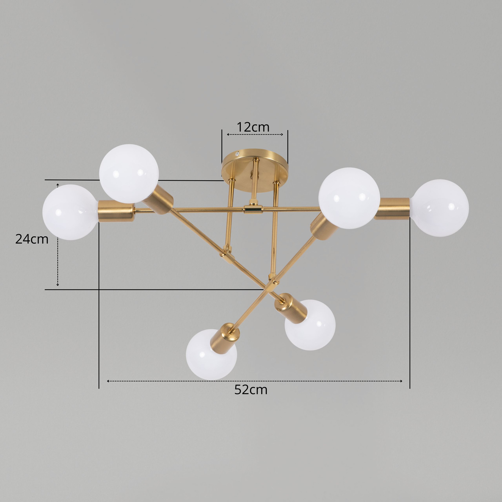 Metalowa konstrukcja w szlachetnym złotym kolorze nadaje lampie luksusowego wyglądu, a symetryczny układ ramion z sześcioma precyzyjnie rozmieszczonymi gwintami zapewnia harmonijne rozproszenie światła w całym pomieszczeniu.