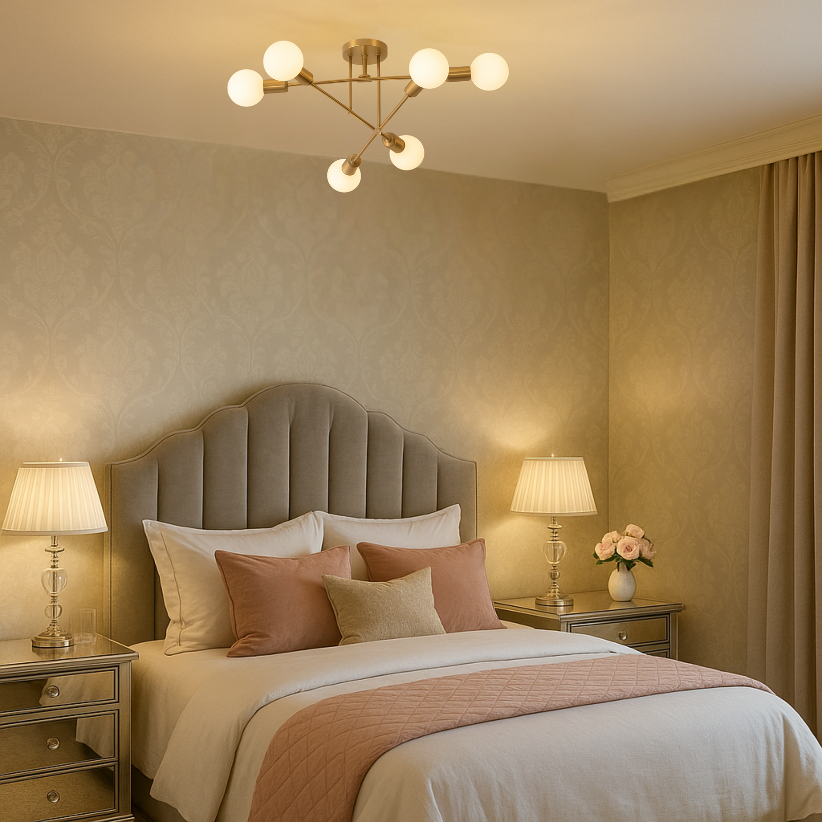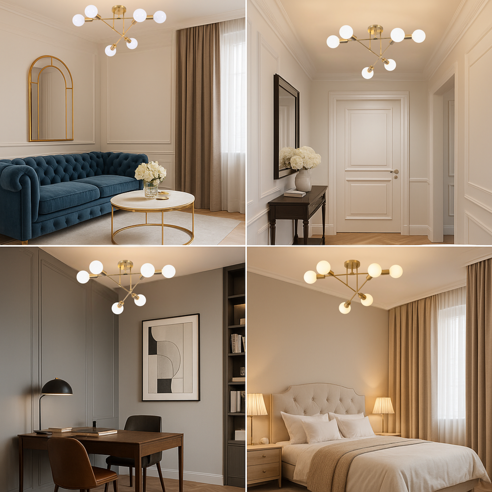 W kolekcji znajdziesz lampy 6-punktowe w czterech wariantach kolorystycznych: złotym, czarno-złotym, biało-złotym oraz chromowanym (srebrnym). Każdy model został wykonany z trwałego metalu i wyposażony w gniazdna na żarówki E27, dzięki czemu możesz dobrać źródła światła dopasowane do klimatu wnętrza – od dekoracyjnych filamentów po klasyczne żarówki LED.