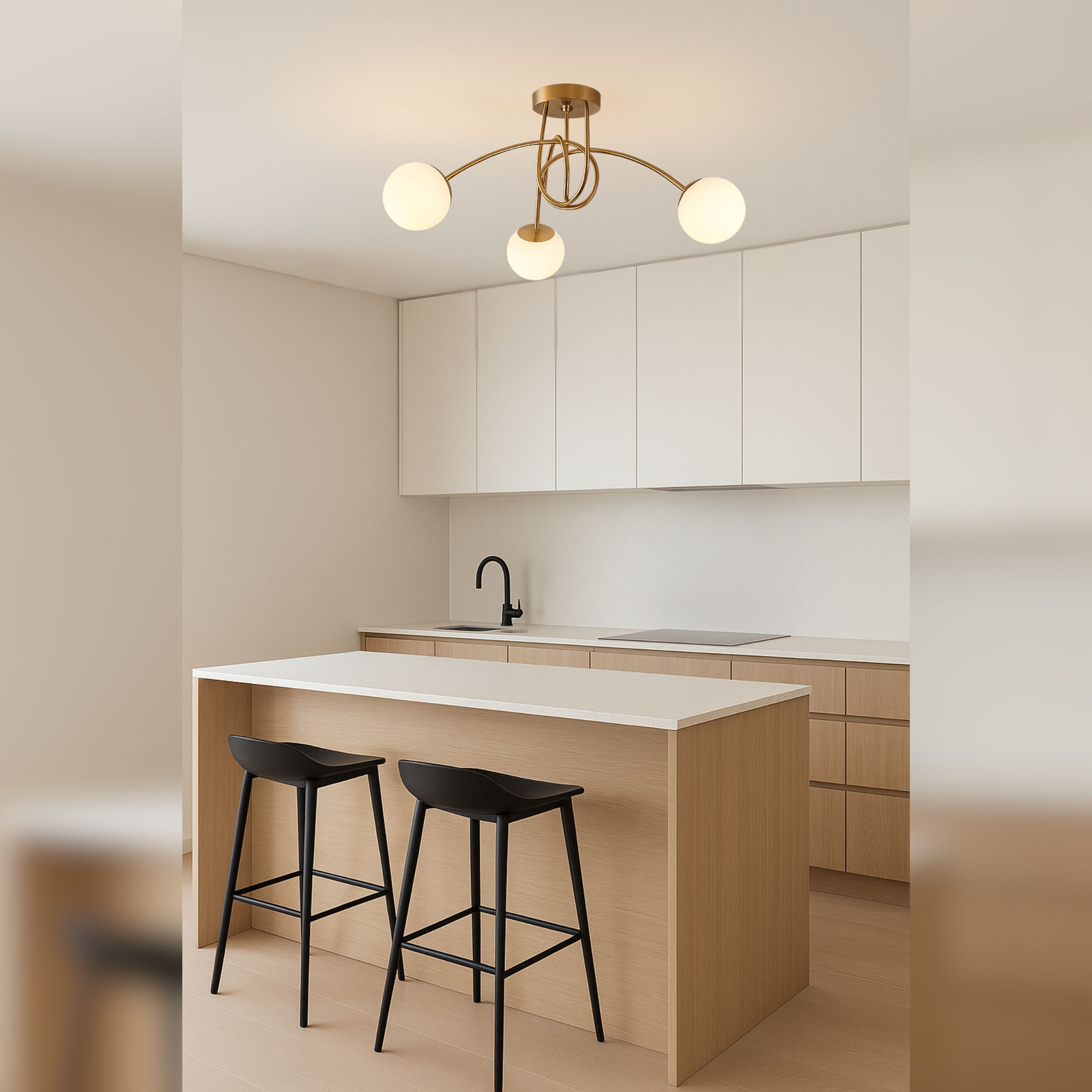 Ta lampa sufitowa zgrabnie łączy surowy minimalizm - geometryczny kształt, miękkie, metaliczne linie, symetrię - z subtelnym luksusem w dobrym guście, którego wyrazem jest kolor złoty z łagodnym, ale zauważalnym połyskiem, a także mleczne wykończenie okrągłych kloszy.