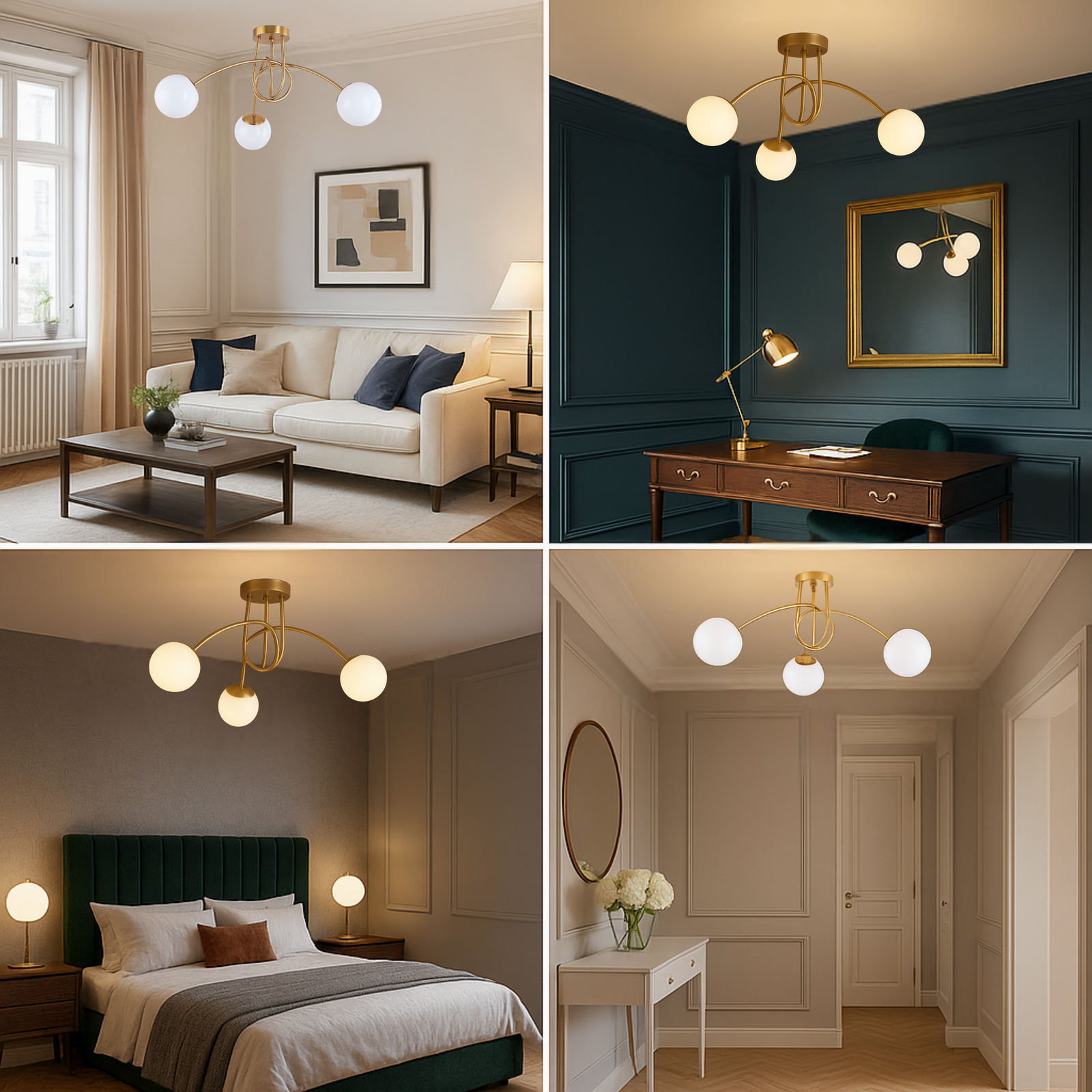 Lampa sufitowa świetnie sprawdzi się w salonie, jadalni, sypialni, biurze, a nawet w korytarzu. Pasuje do wnętrz nowoczesnych, w stylu nowojorskim, glamour, vintage, mid-century modern.