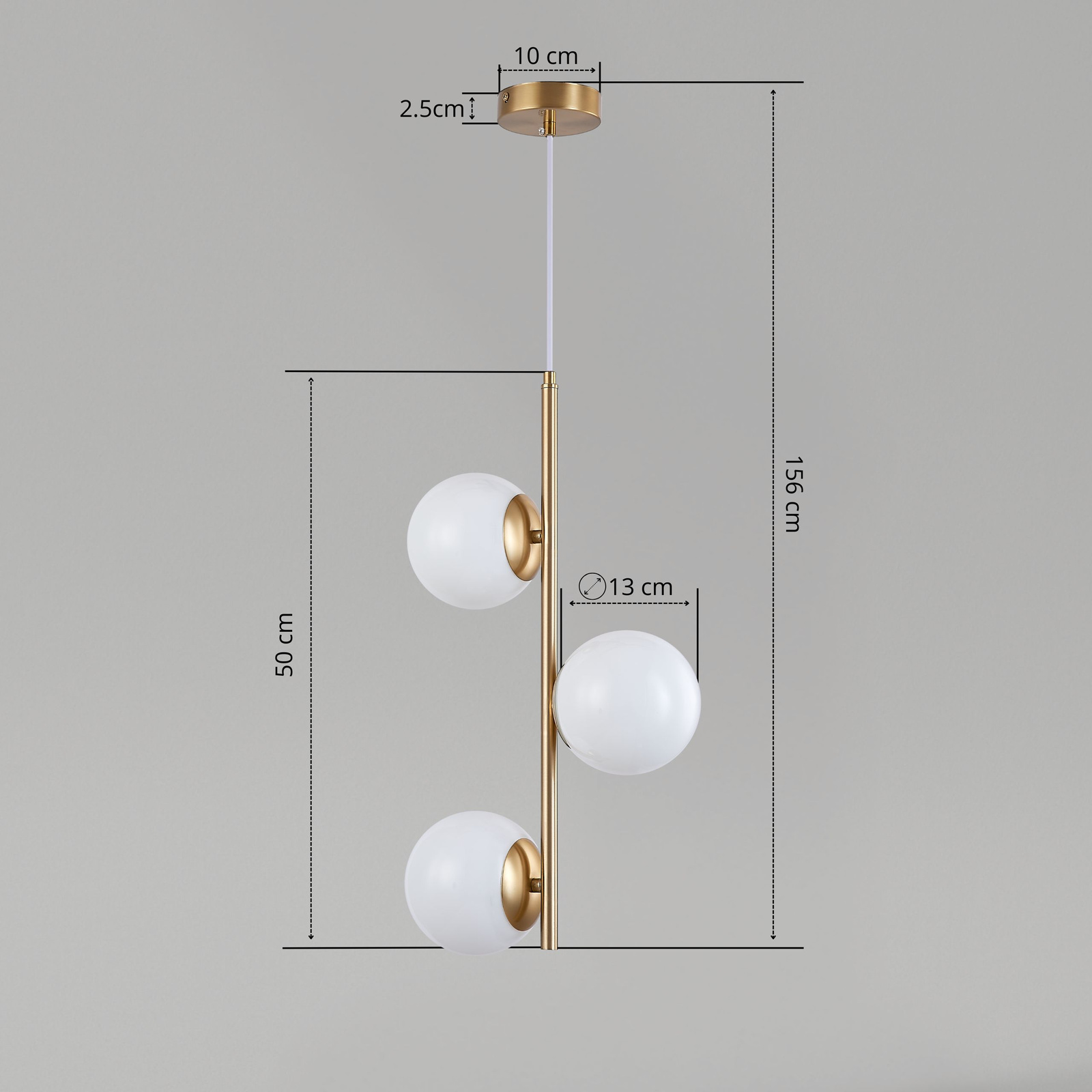Ta lampa wisząca wykonana jest z metalu w kolorze złotym – trwała i odporna na zarysowania. W zestawie są też trzy klosze w kształcie kuli, wykonane z białego szkła o mlecznym odcieniu.