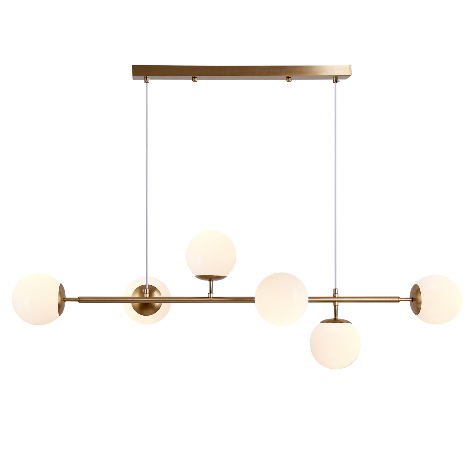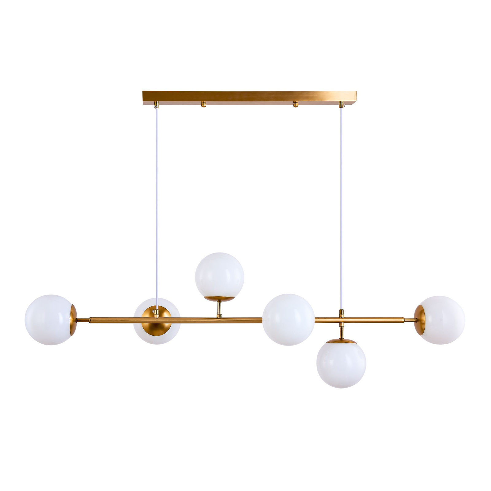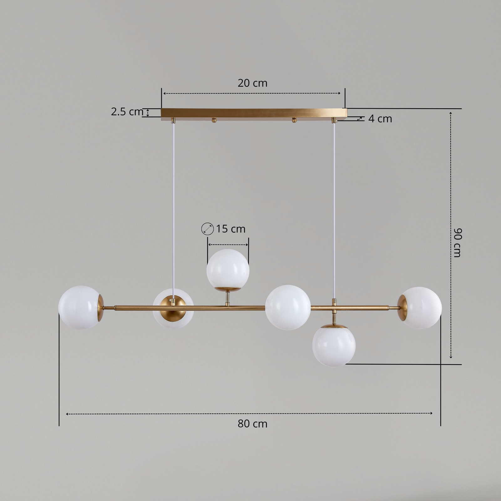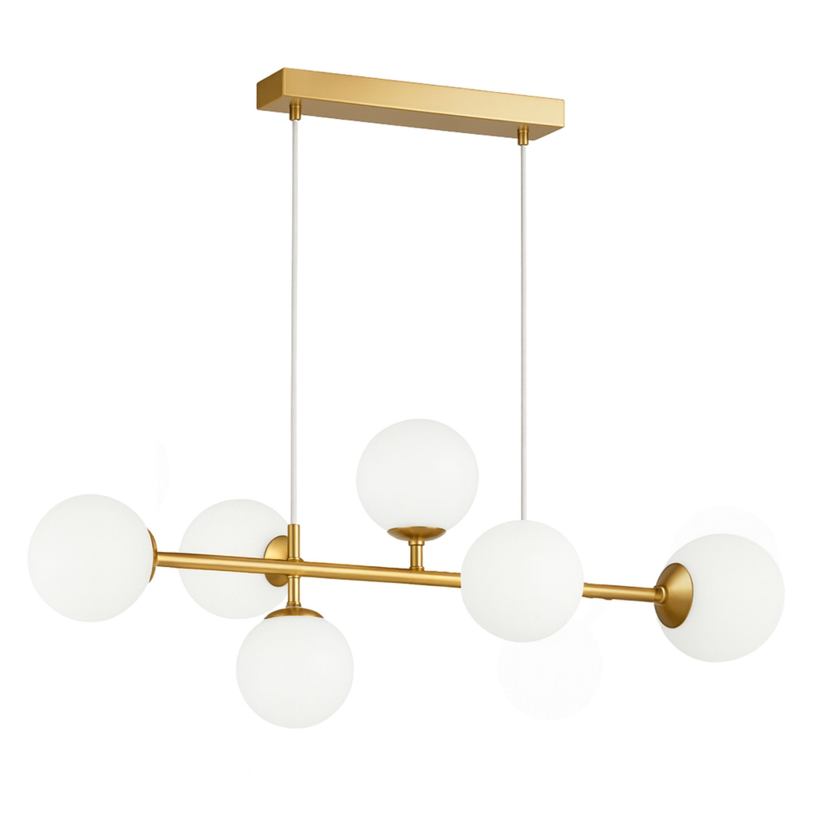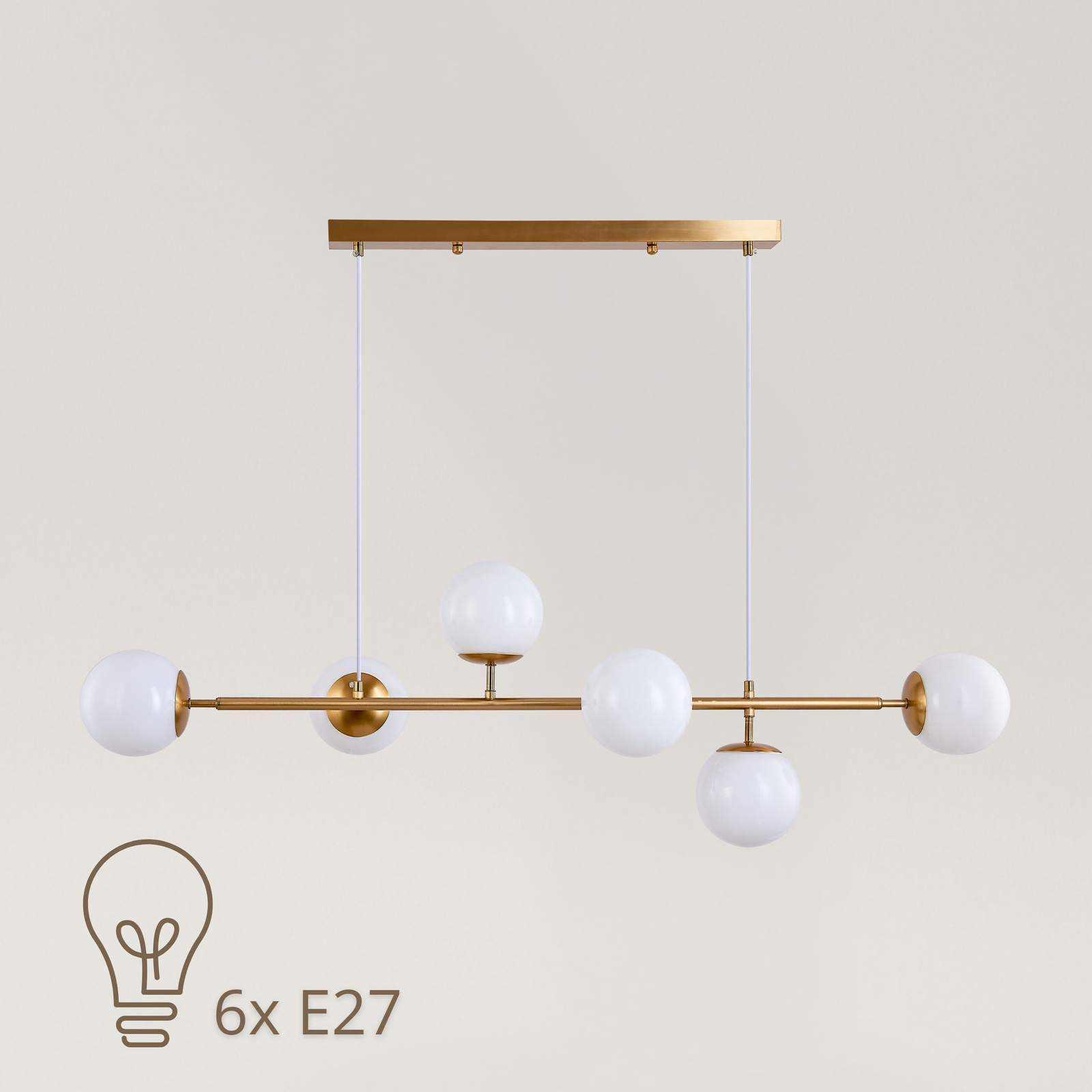 Ta lampa wisząca wykonana jest z metalu w kolorze złotym – trwała i odporna na zarysowania. W zestawie jest też sześć okrągłych kloszów w kształcie kuli, wykonane z białego szkła o mlecznym odcieniu.
