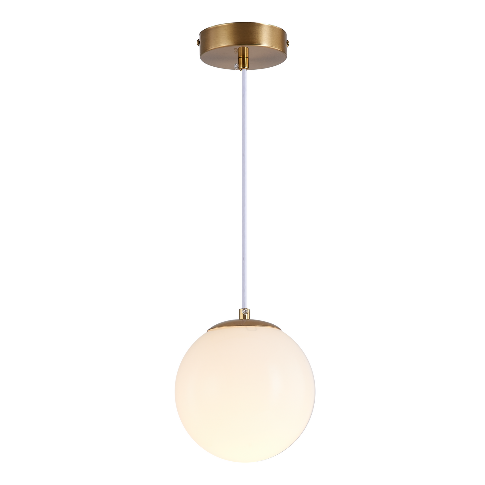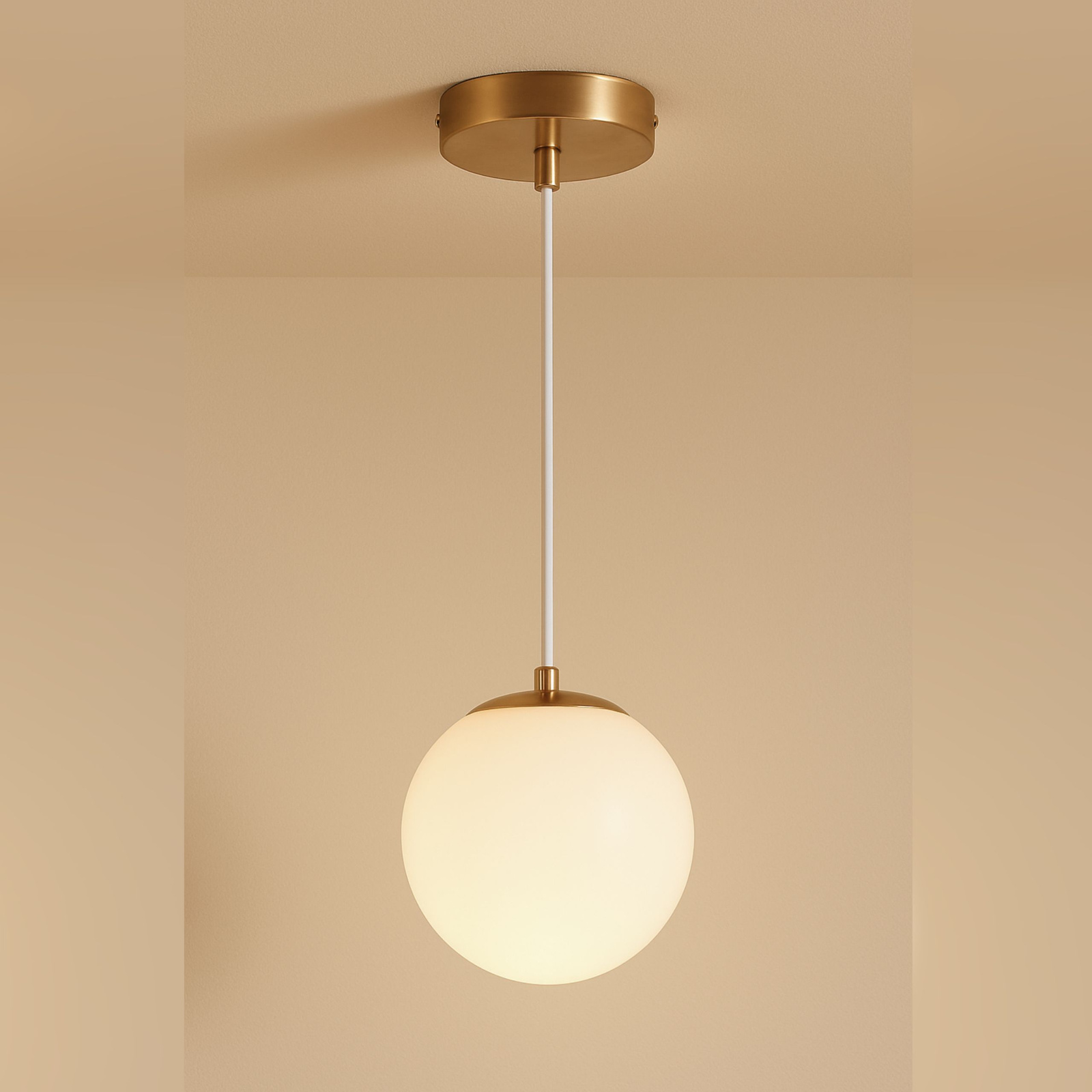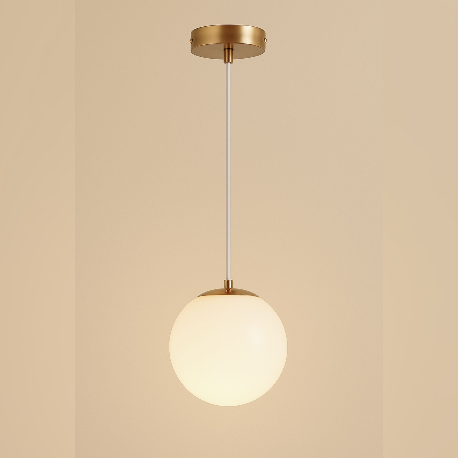 Klosz wykonano z mlecznego szkła opalowego, a elementy wykończeniowe z metalu w kolorze łagodnego złota.