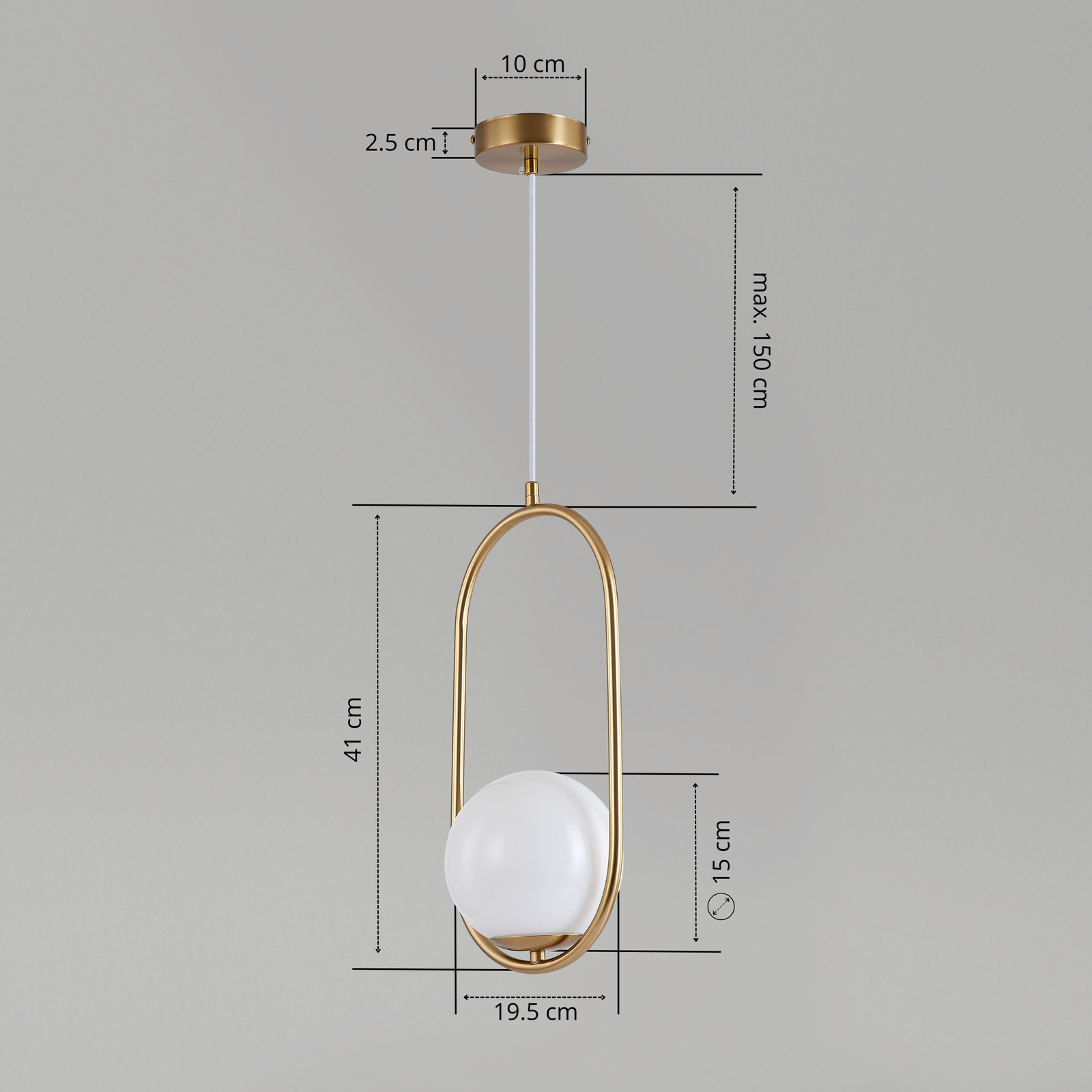 Klosz wykonano z mlecznego szkła opalowego, a elementy wykończeniowe i ramę z metalu w kolorze łagodnego złota.