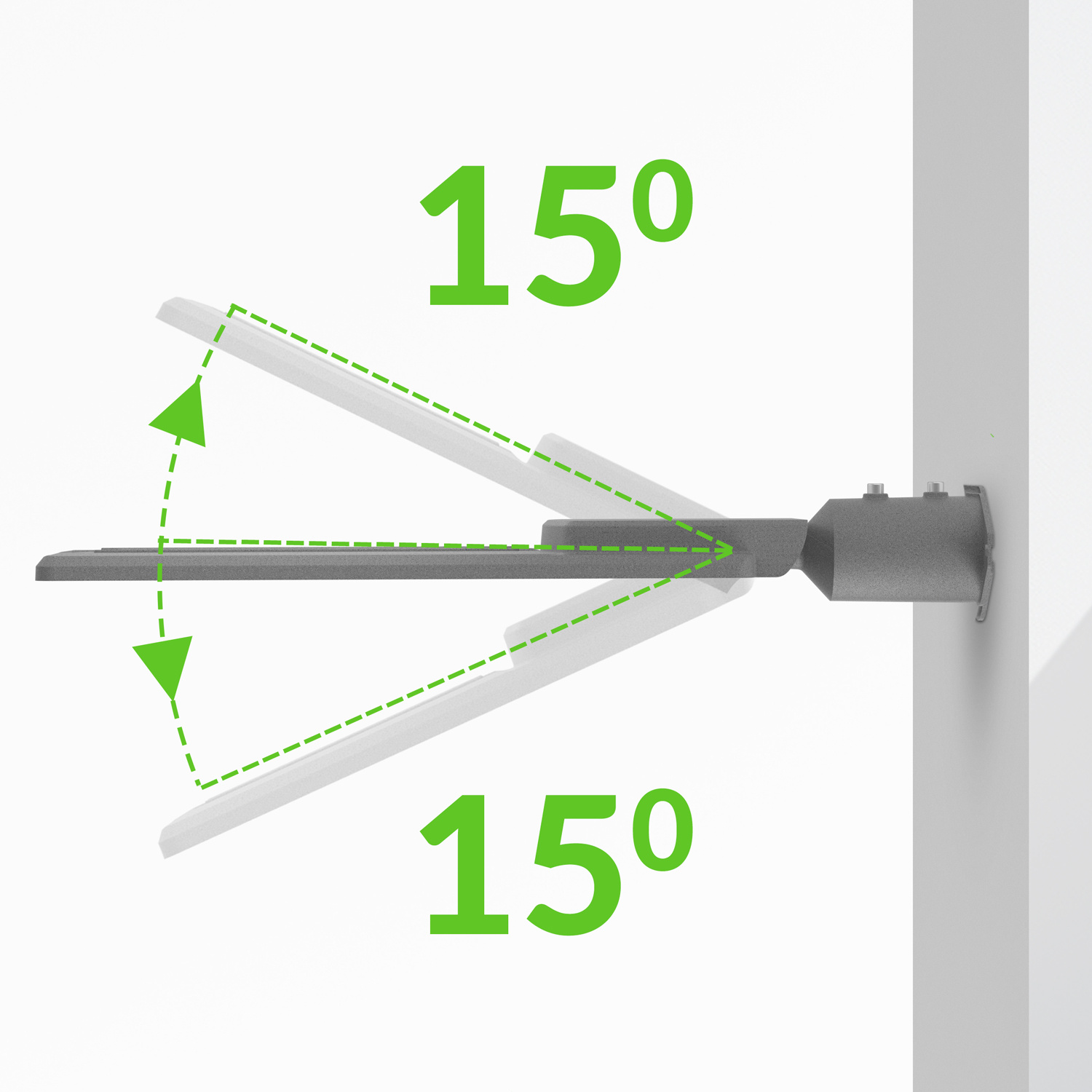 Ta lampa uliczna LED ma też dodatkową funkcję, czyli regulowany kąt świecenia - jej uchwyt posiada wbudowaną regulację, która umożliwia dostosowanie kąta nachylenia lampy w zależności od potrzeb.