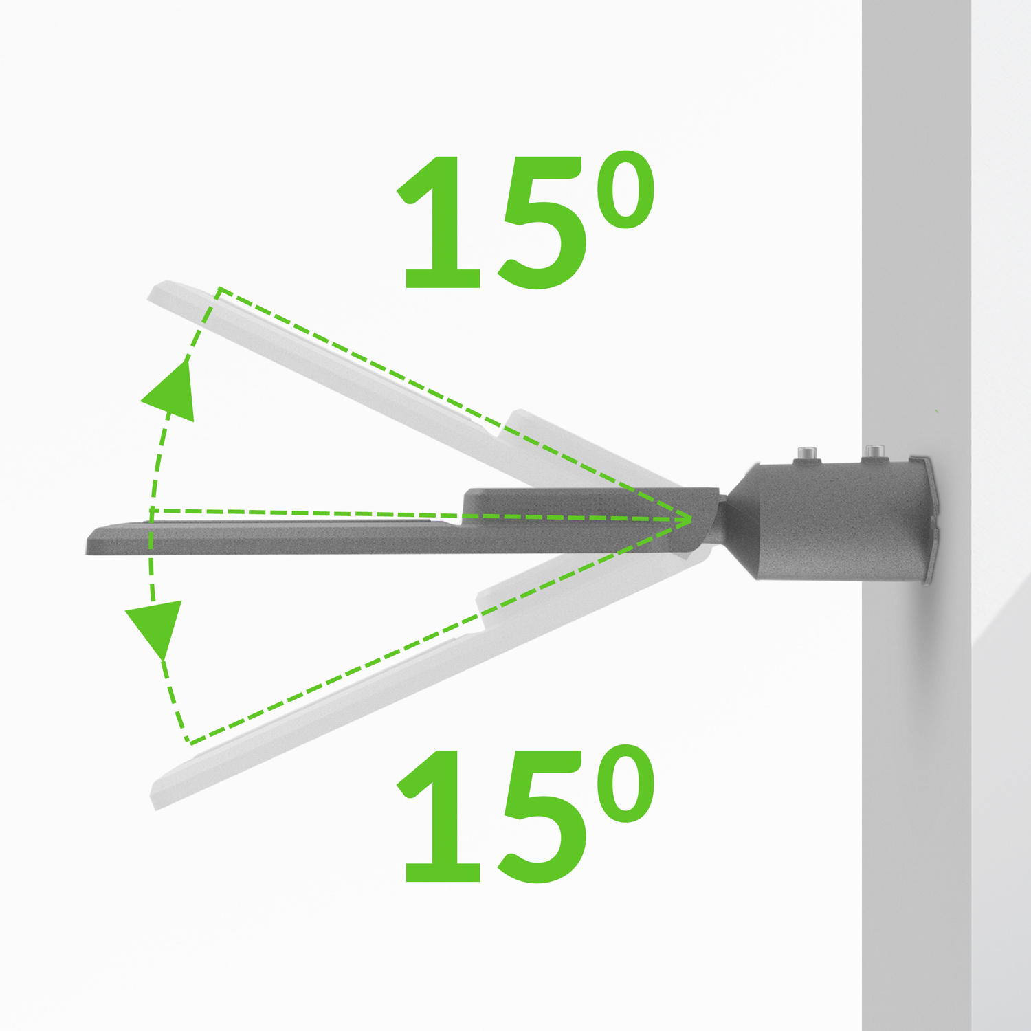 Ta lampa uliczna LED ma też dodatkową funkcję, czyli regulowany kąt świecenia - jej uchwyt posiada wbudowaną regulację, która umożliwia dostosowanie kąta nachylenia lampy w zależności od potrzeb.