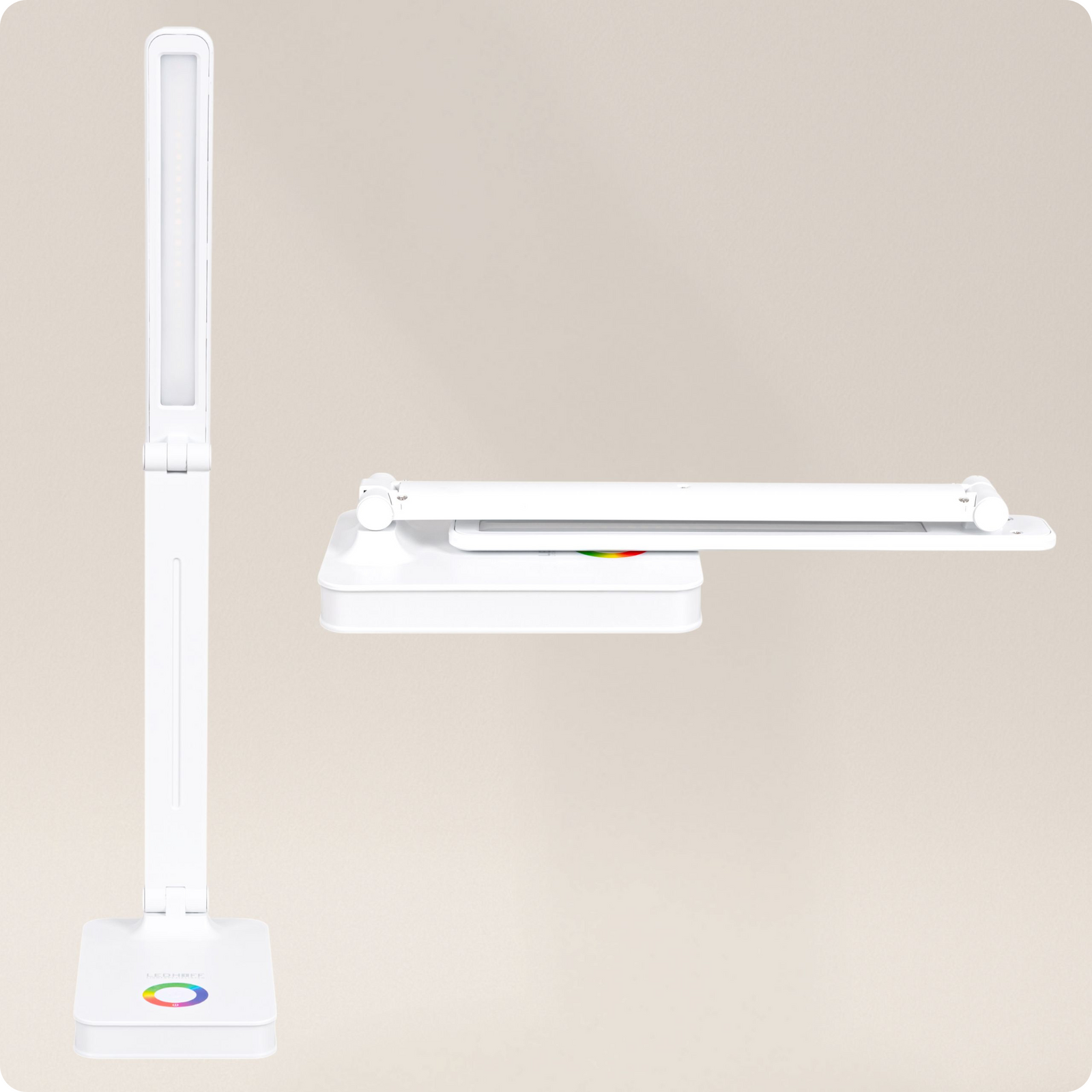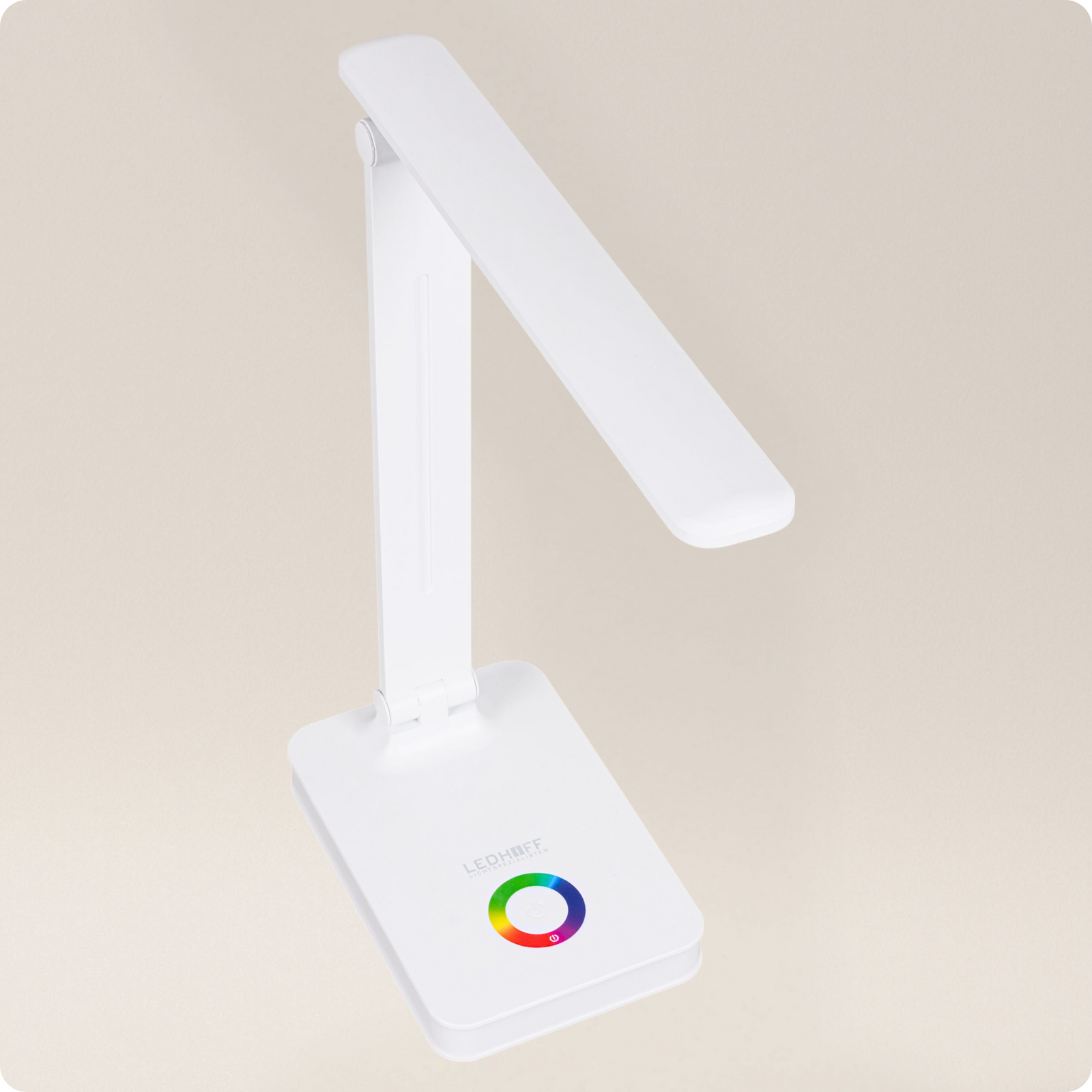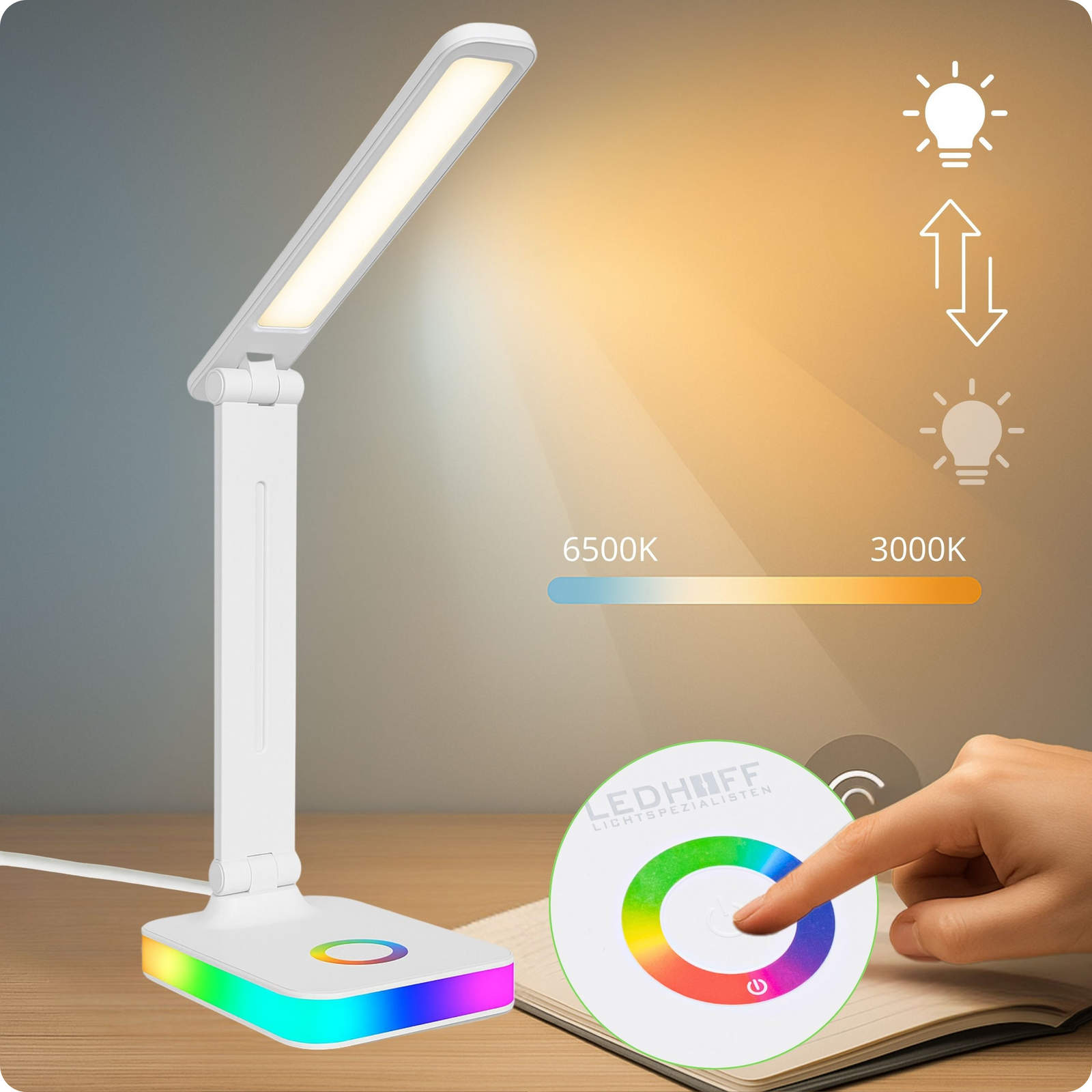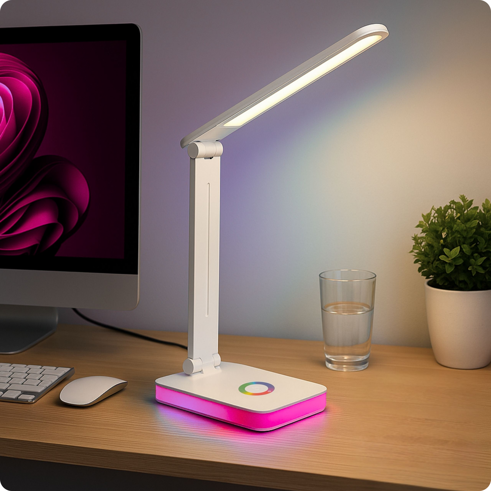 Nowoczesna lampka na biurko z możliwością regulacji intensywności i barwy światła, portem USB i podstawą podświetlaną na wybrany kolor z palety RGB.