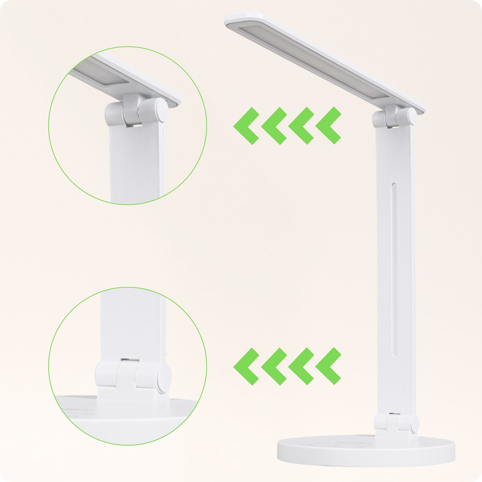 Tak, lampka posiada składane i regulowane ramię, które pozwala precyzyjnie ustawić kierunek światła — idealne do czytania, pisania lub pracy przy komputerze.