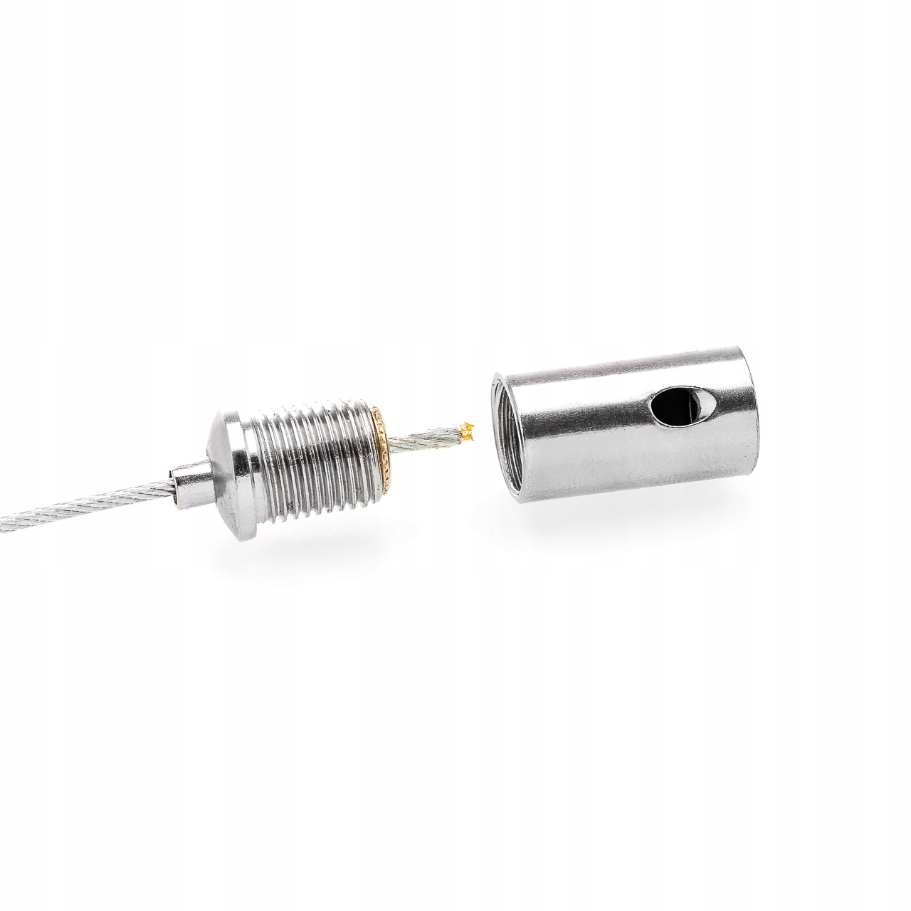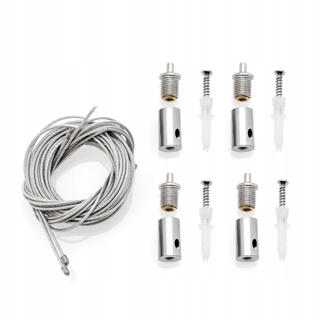 Uniwersalny zestaw 4 stalowych linek o długości 3 metrów, umożliwiający np. podwieszenie paneli LED do sufitu. Linki z jednej strony zakończone są zgrubieniem. Drugi koniec linki należy zamontować w samoblokującym się uchwycie, który należy przymocować do sufitu.