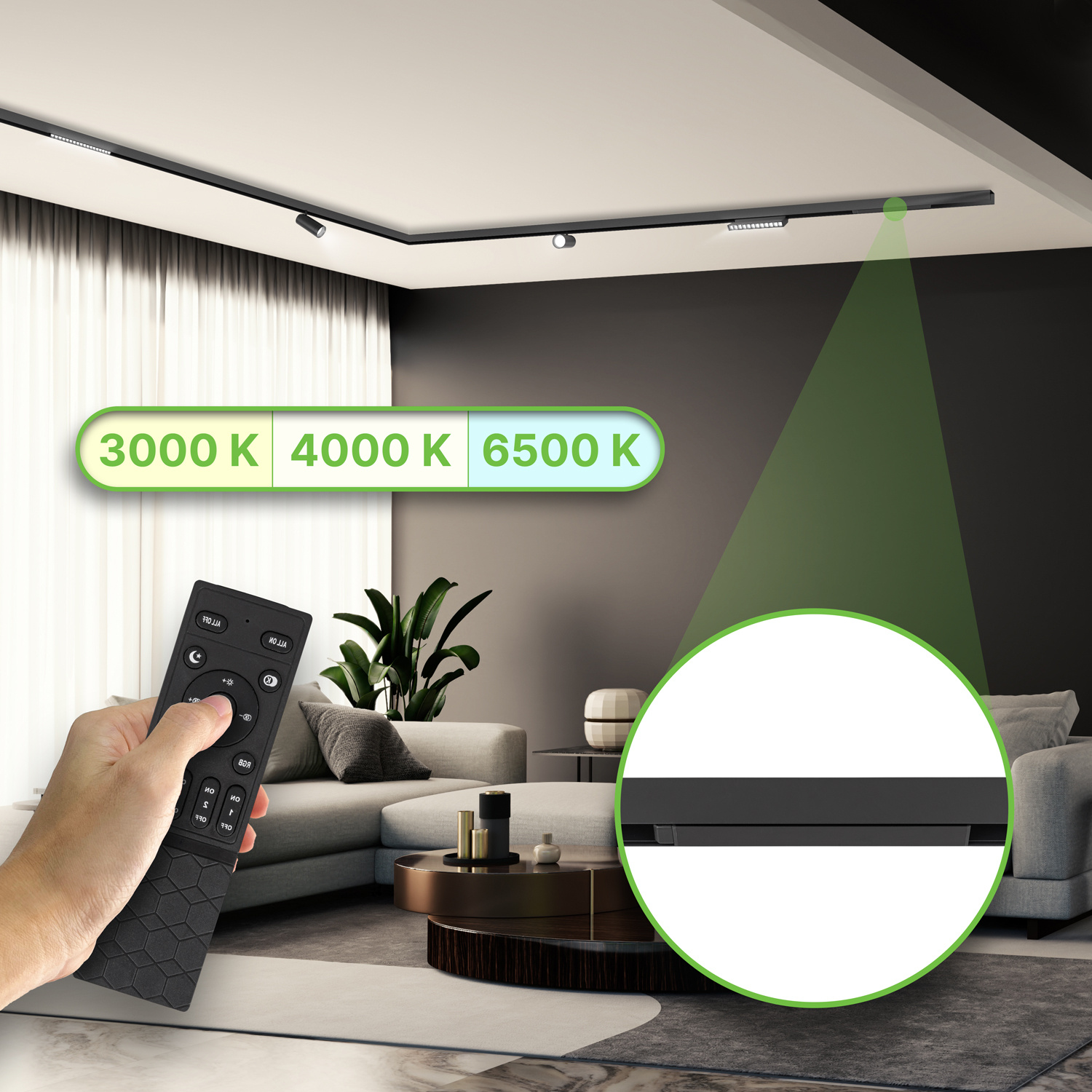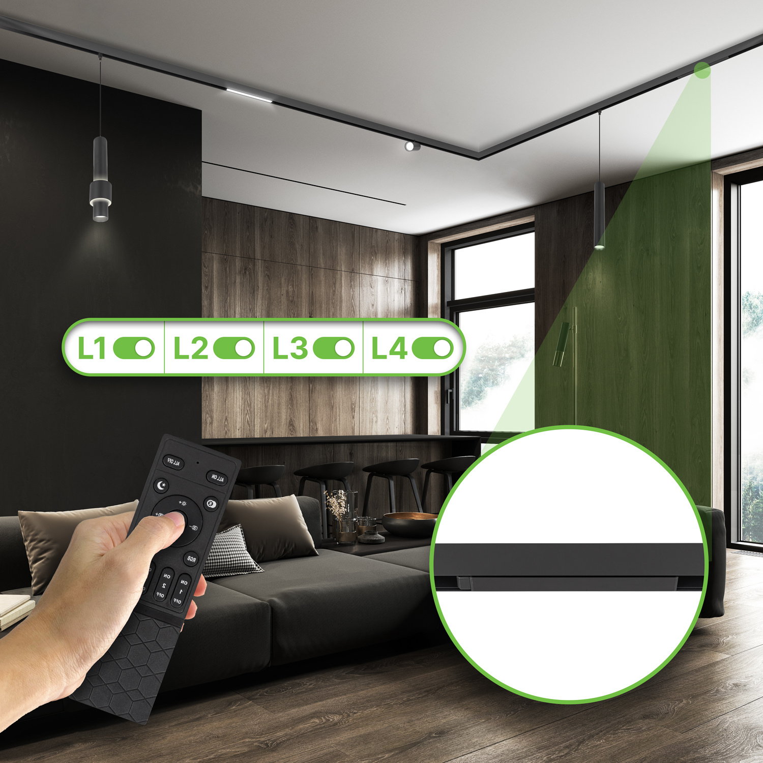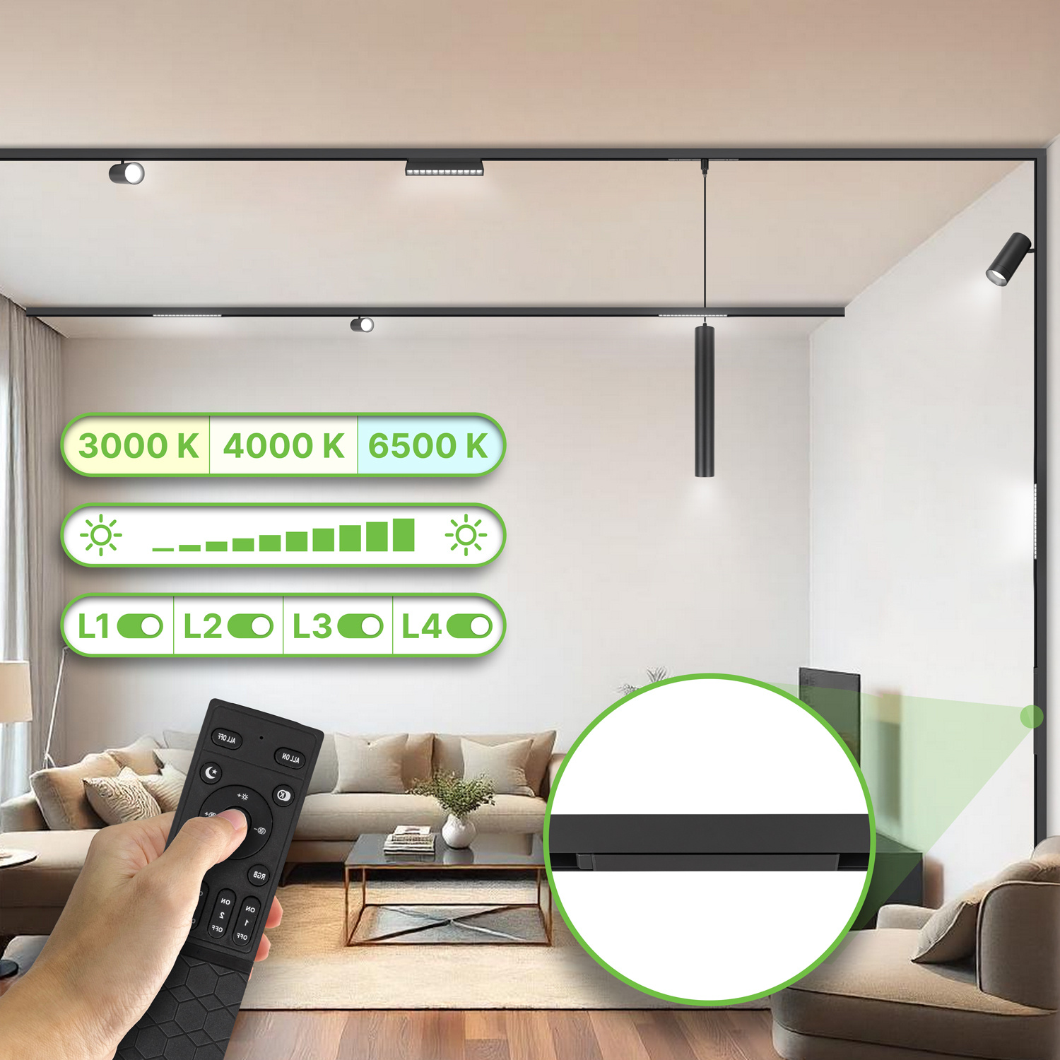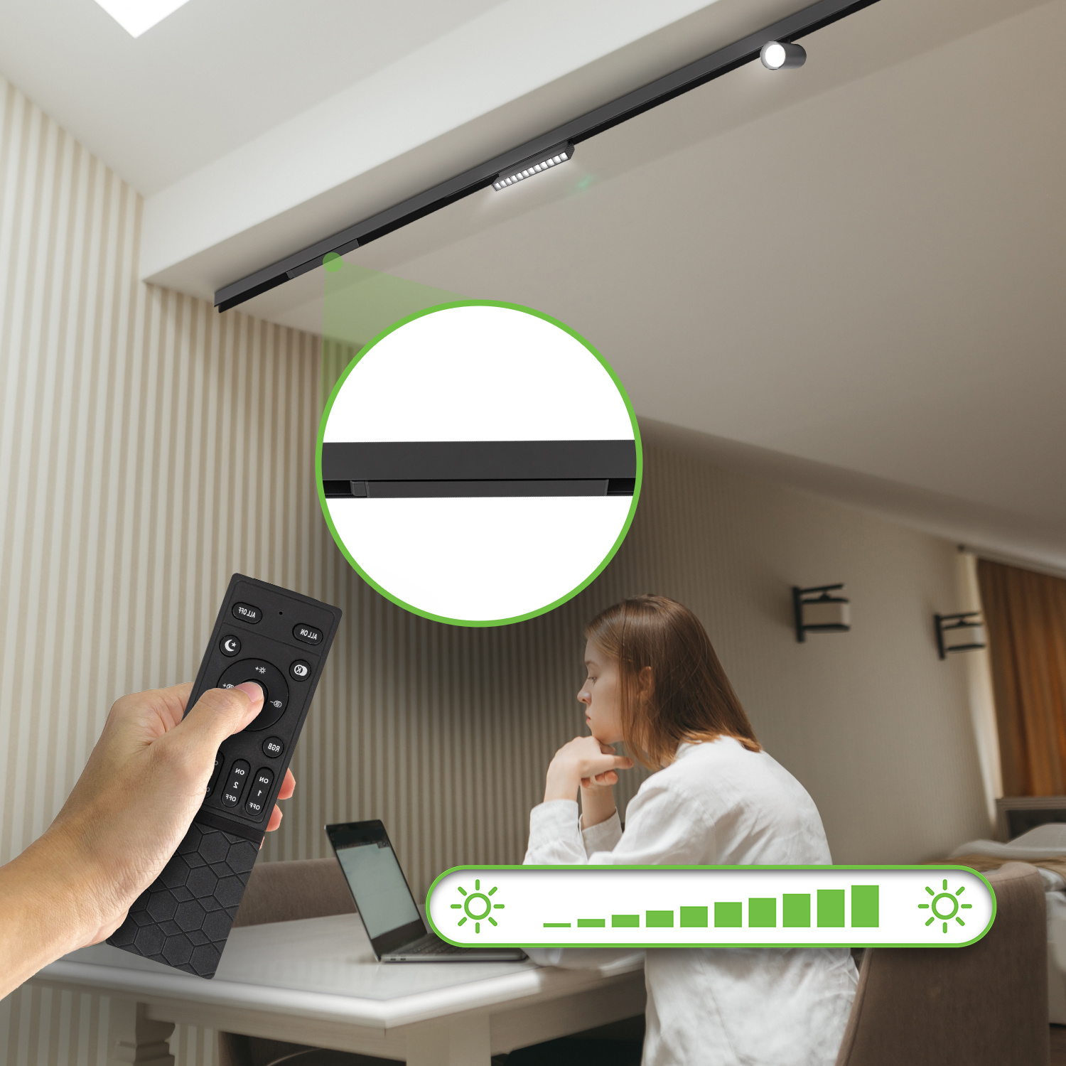 W zestawie, oprócz zasilacza, znajduje się także pilot zdalnego sterowania, który umożliwi Ci wykorzystanie pełnego potencjału Twojego zestawu oświetlenia szynowego magnetycznego.