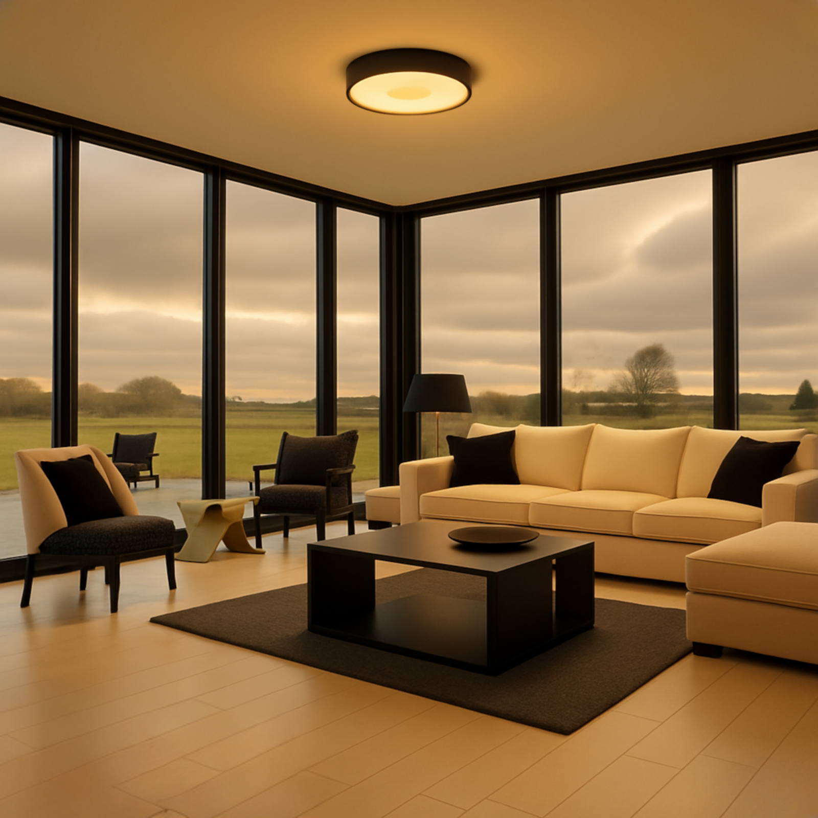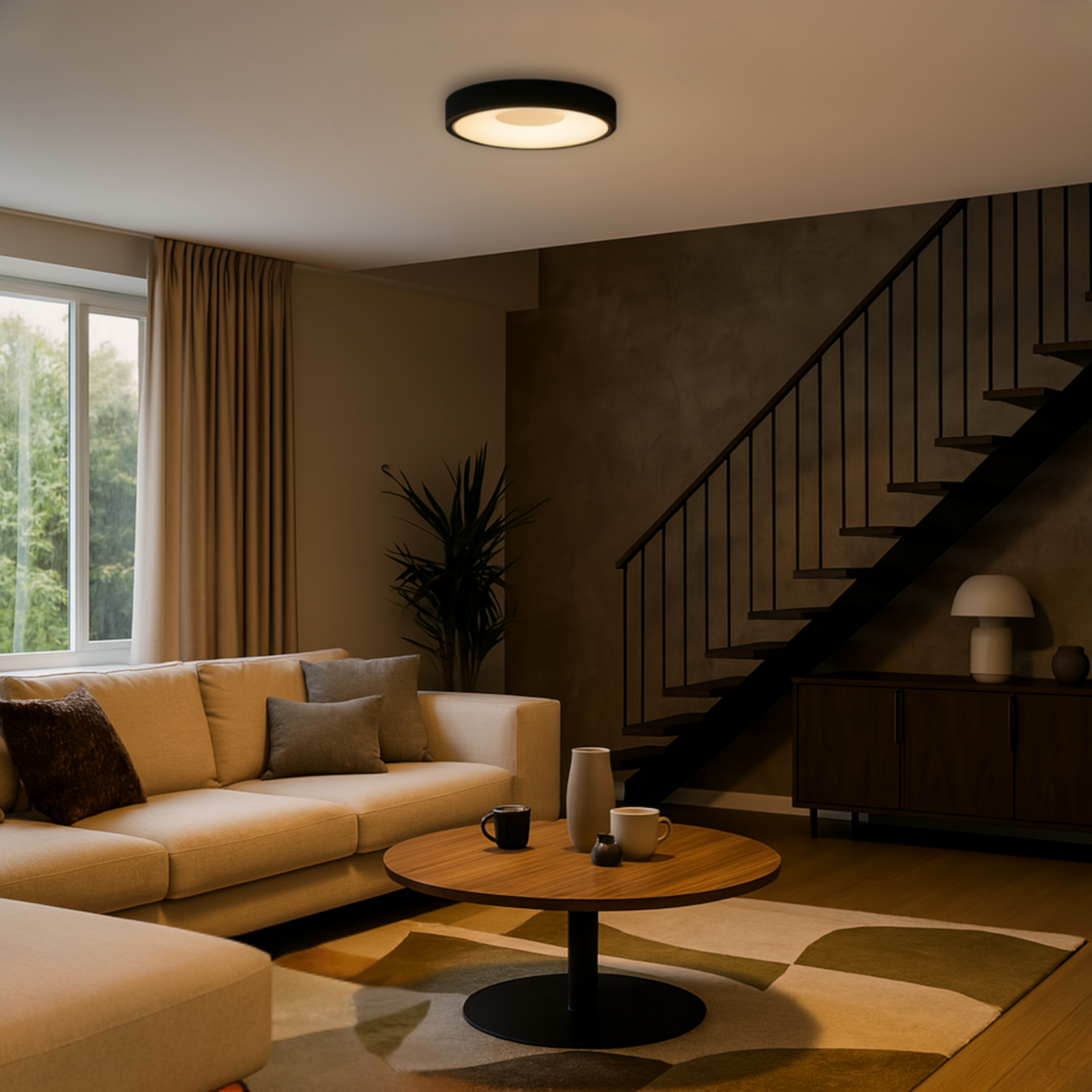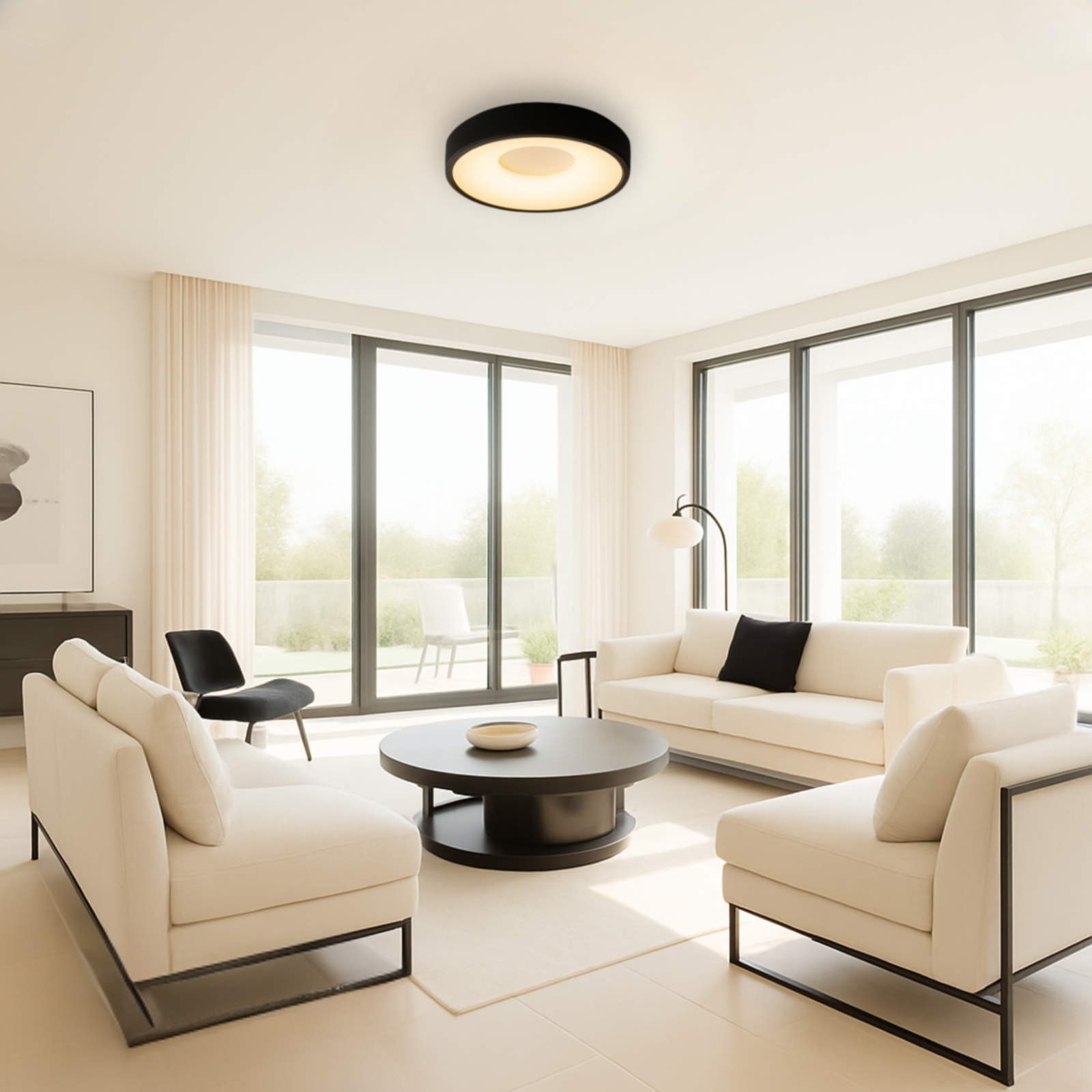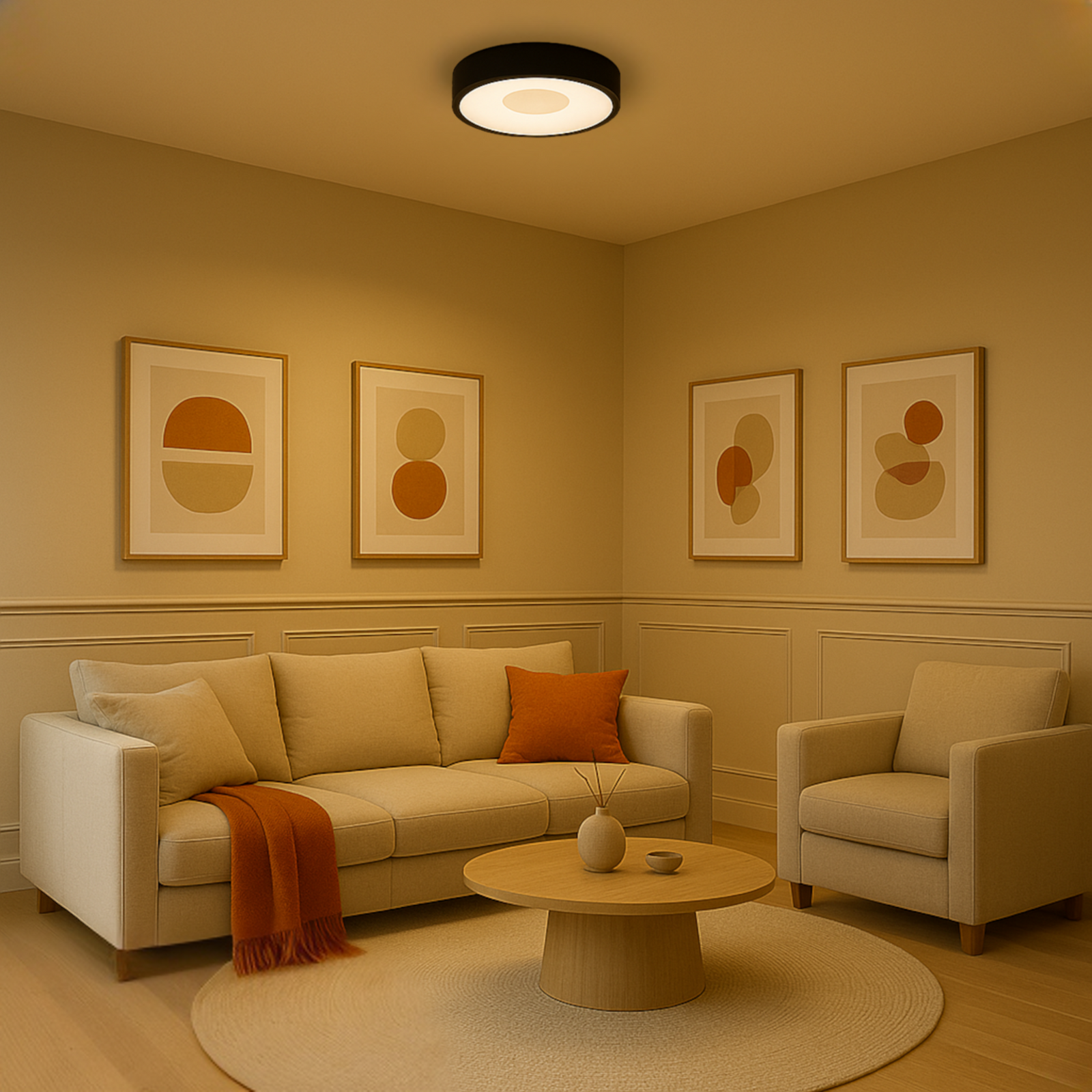 To, co wyróżnia te lampy, to sposób podświetlenia: światło emitowane jest wyłącznie z zewnętrznej krawędzi, podczas gdy środek plafonu pozostaje ciemny. Tworzy to wyjątkowy, dekoracyjny efekt świetlnej obręczy, który nadaje wnętrzu elegancki i nowoczesny charakter – bez oślepiającego blasku.
