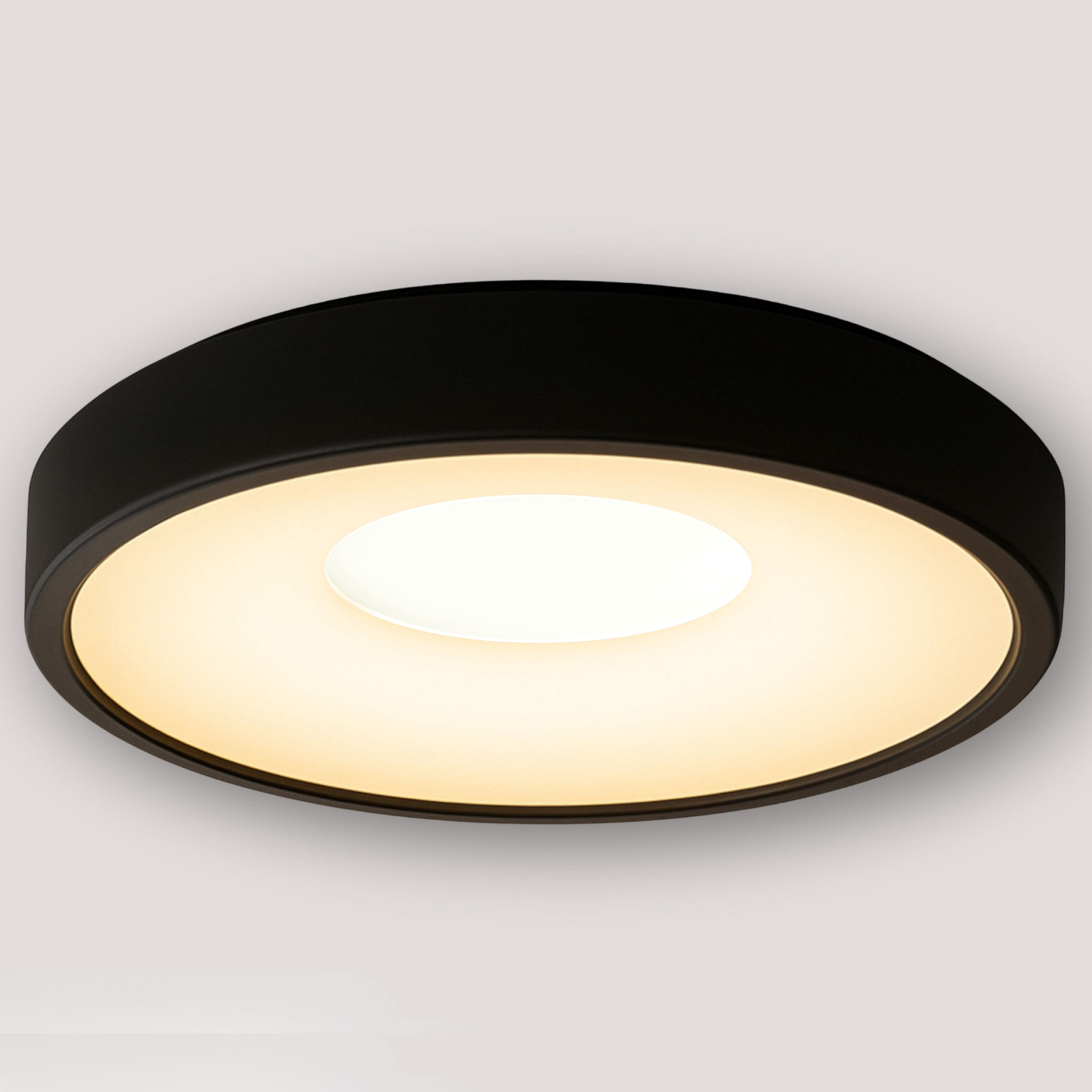 To, co wyróżnia te lampy, to sposób podświetlenia: światło emitowane jest wyłącznie z zewnętrznej krawędzi, podczas gdy środek plafonu pozostaje ciemny. Tworzy to wyjątkowy, dekoracyjny efekt świetlnej obręczy, który nadaje wnętrzu elegancki i nowoczesny charakter – bez oślepiającego blasku.