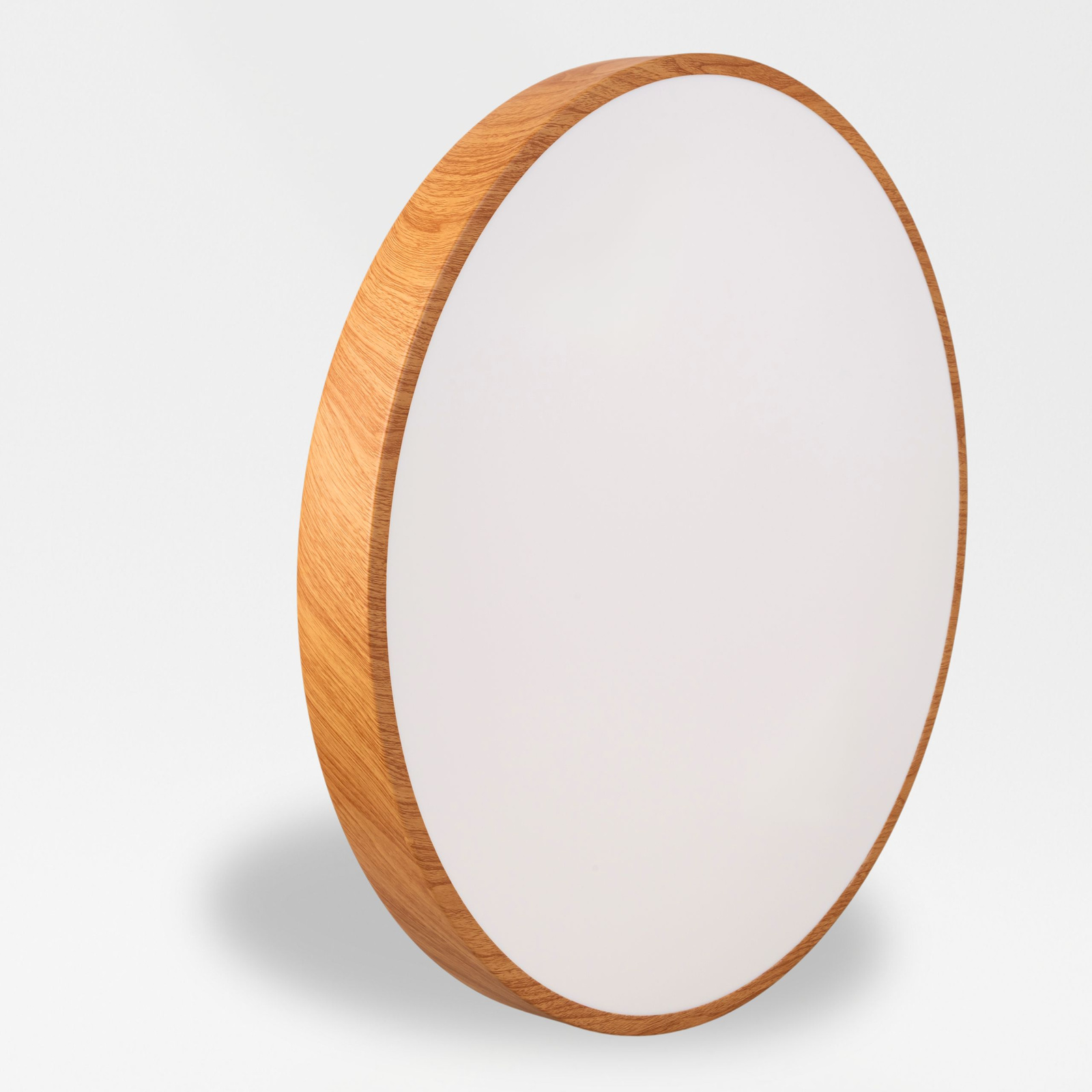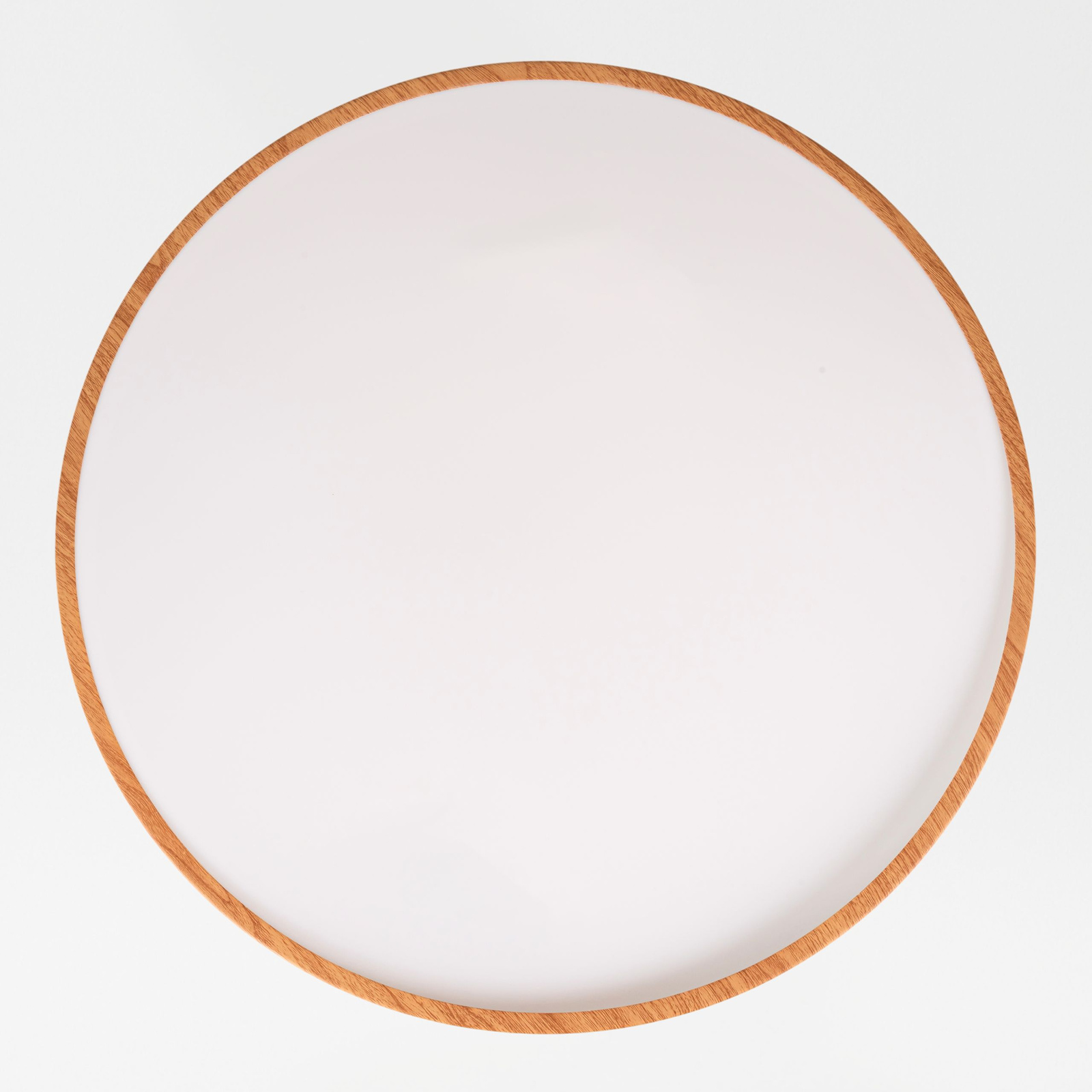 Nowoczesna lampa sufitowa LED typu plafon łączy w sobie minimalizm klasycznej, okrągłej formy i wysoką estetykę drewnianego wzoru w ciepłym, przyjemnym odcieniu.