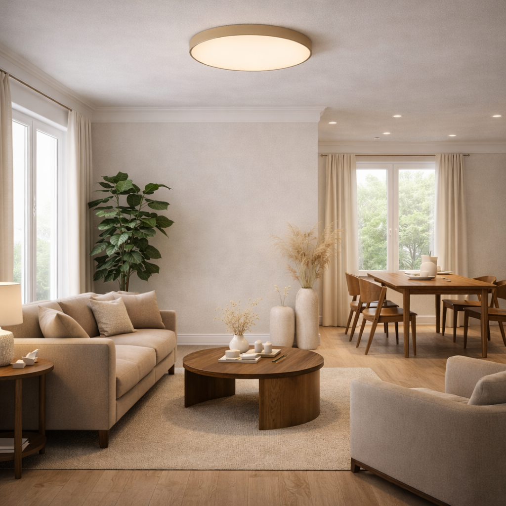 Lampa sufitowa o strumieniu świetlnym 6000 lumenów i kącie świecenia 120° jest idealna do pomieszczeń o powierzchni 20–35 m², takich jak salon z aneksem kuchennym, duża sypialnia, biuro/pracownia, otwarta jadalnia czy pomieszczenia z wysokim sufitem.