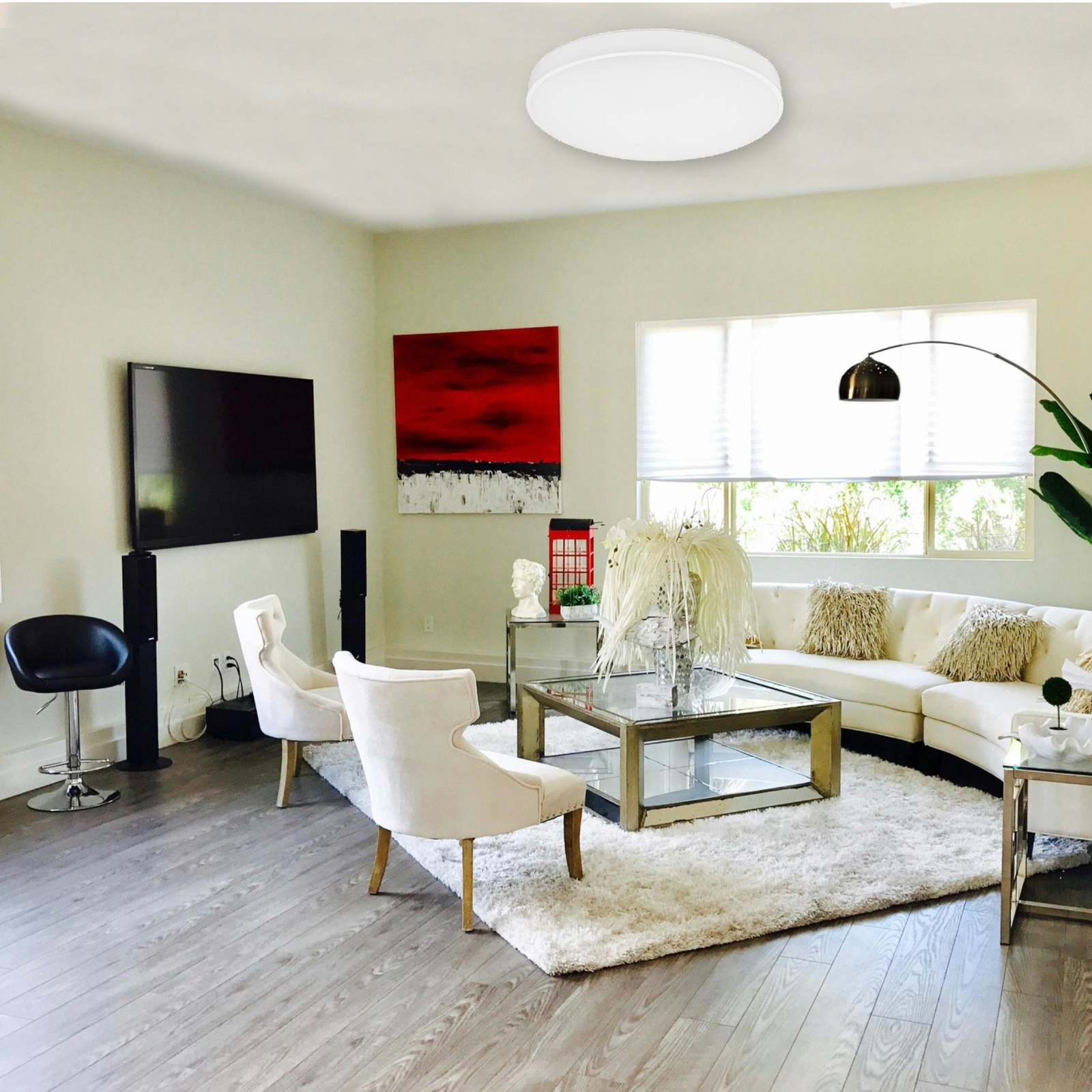 Lampa sufitowa o strumieniu świetlnym 6000 lumenów i kącie świecenia 120° jest idealna do pomieszczeń o powierzchni 20–35 m², takich jak salon z aneksem kuchennym, duża sypialnia, biuro/pracownia, otwarta jadalnia czy pomieszczenia z wysokim sufitem.