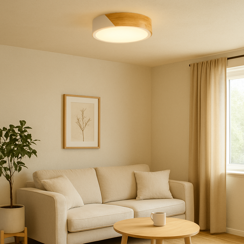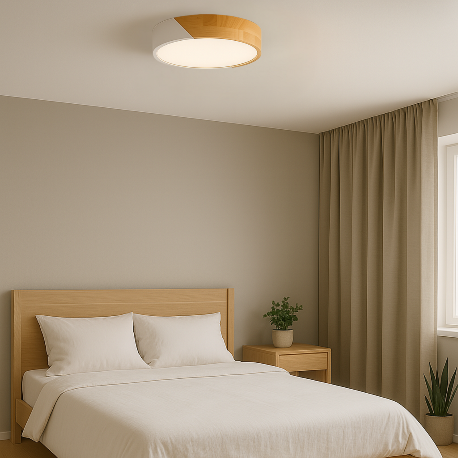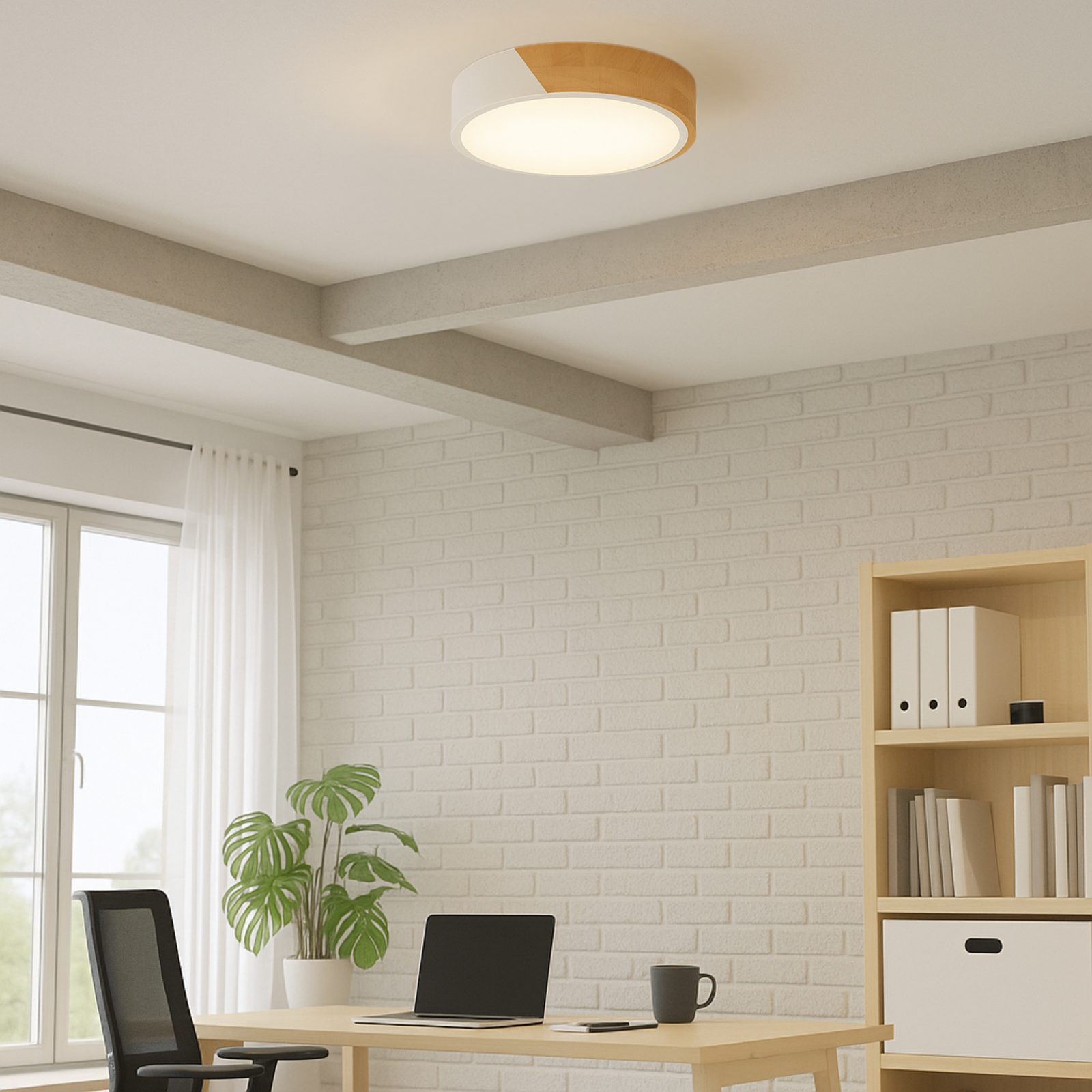 W kolekcji znajdziesz okrągłe plafony w różnych rozmiarach i mocach, dostępne w dwóch klasycznych kolorach – bieli i czerni. Każdy model wykonany jest z trwałego metalu malowanego proszkowo i uzupełniony o dekoracyjną drewnianą nakładkę, która subtelnie ociepla design i sprawia, że lampa pasuje zarówno do wnętrz nowoczesnych, jak i skandynawskich, japandi czy boho.