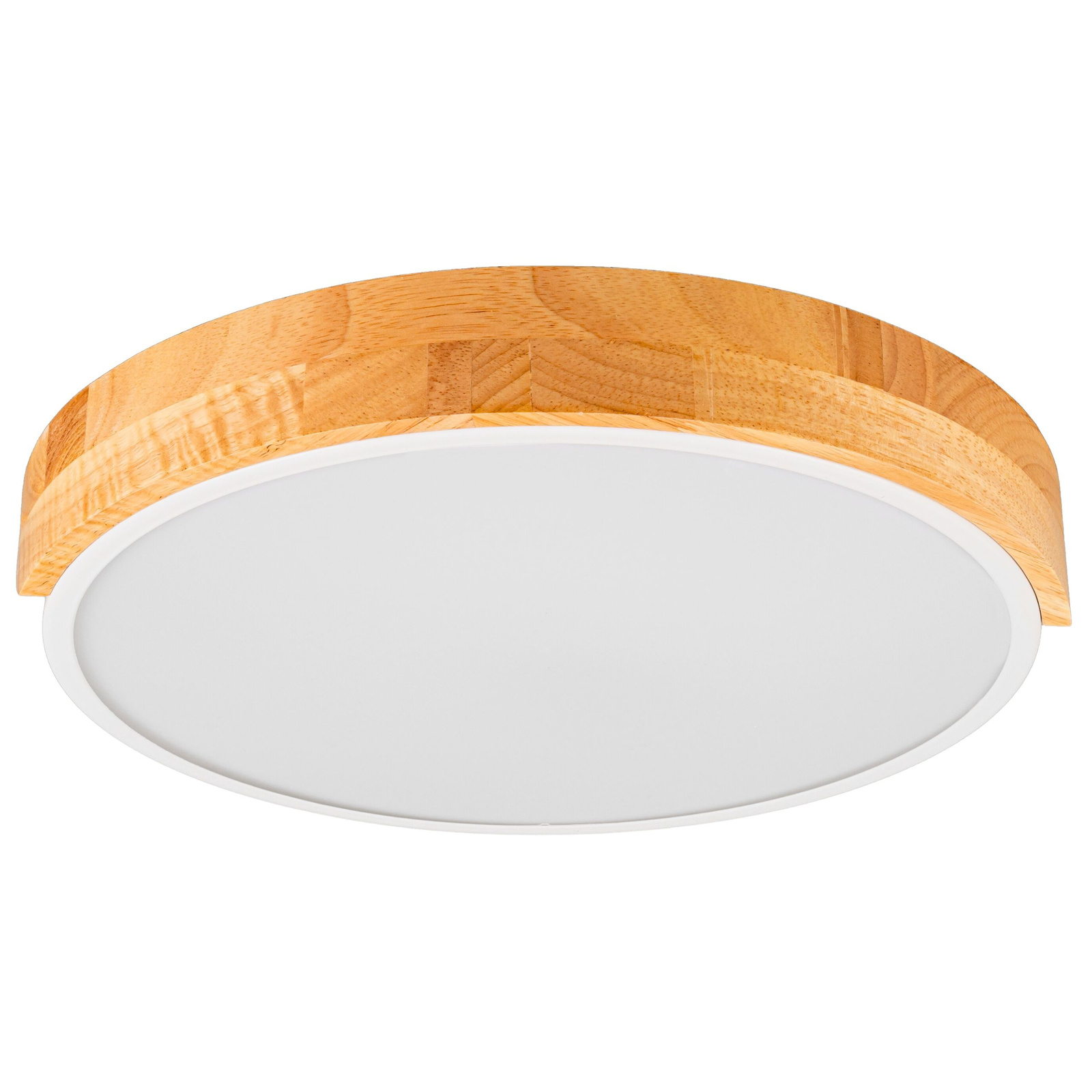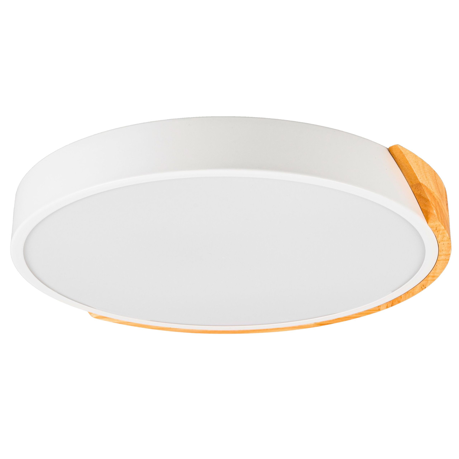 Nowoczesna lampa sufitowa LED typu plafon łączy w sobie minimalizm białego metalu i ciepło naturalnego drewna.