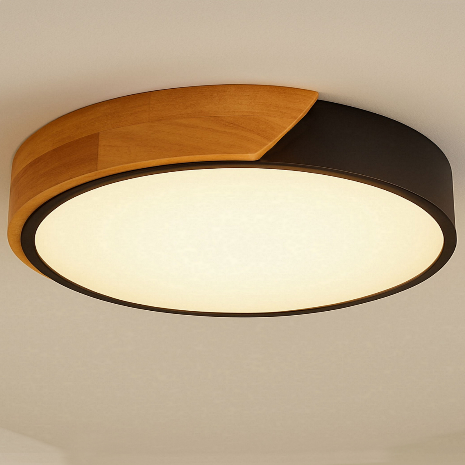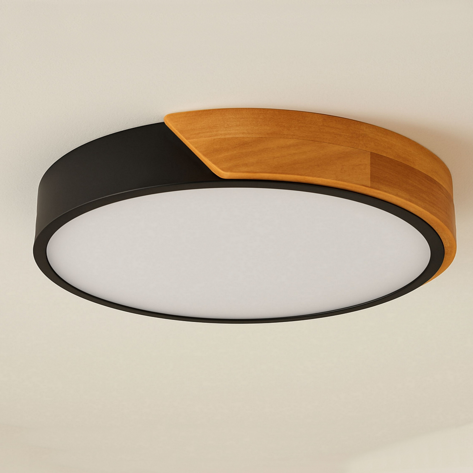 W kolekcji znajdziesz okrągłe plafony w różnych rozmiarach i mocach, dostępne w dwóch klasycznych kolorach – bieli i czerni. Każdy model wykonany jest z trwałego metalu malowanego proszkowo i uzupełniony o dekoracyjną drewnianą nakładkę, która subtelnie ociepla design i sprawia, że lampa pasuje zarówno do wnętrz nowoczesnych, jak i skandynawskich, japandi czy boho.