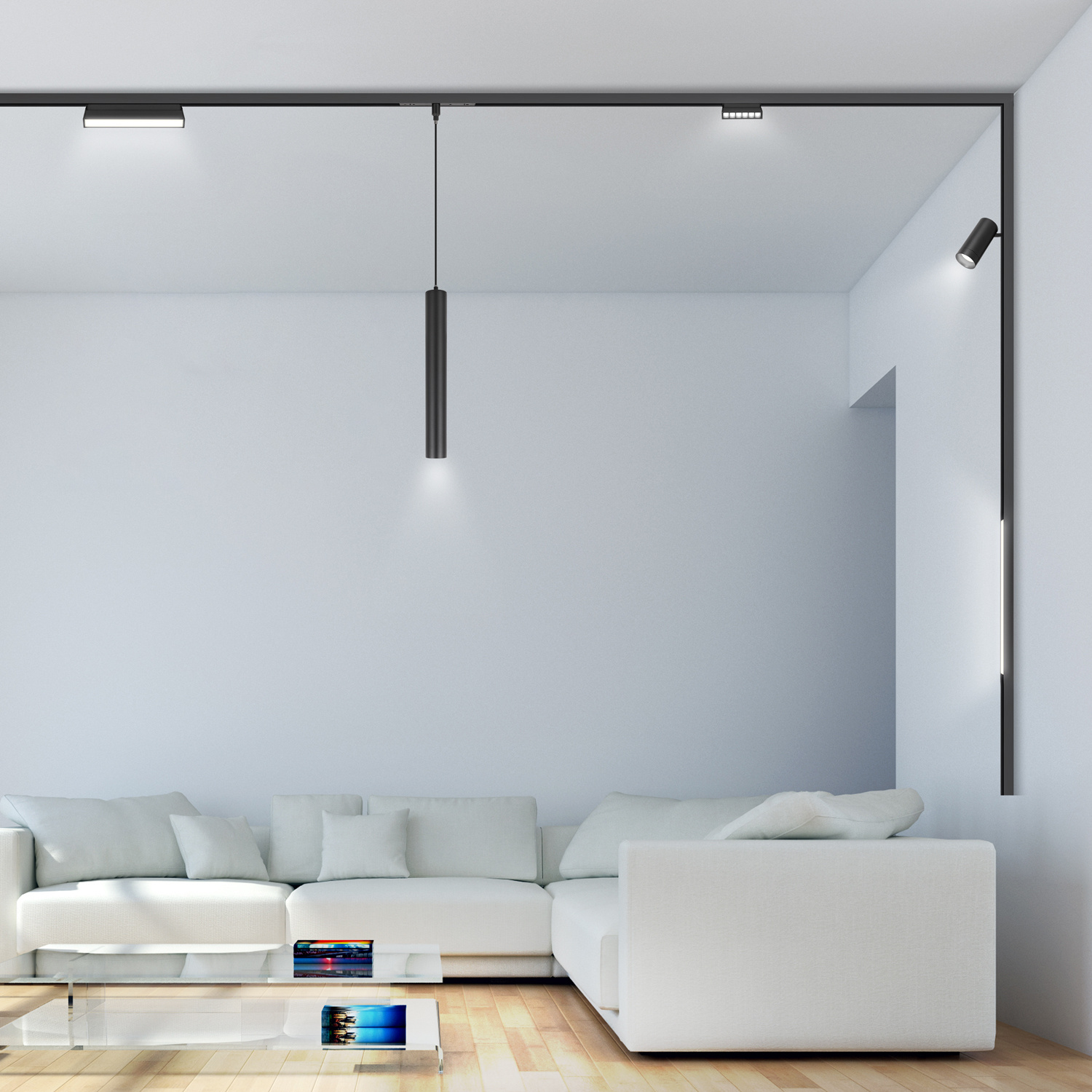 • szyna wpuszczana (podtynkowa) – montowana w suficie podwieszanym, daje elegancki, minimalistyczny efekt,