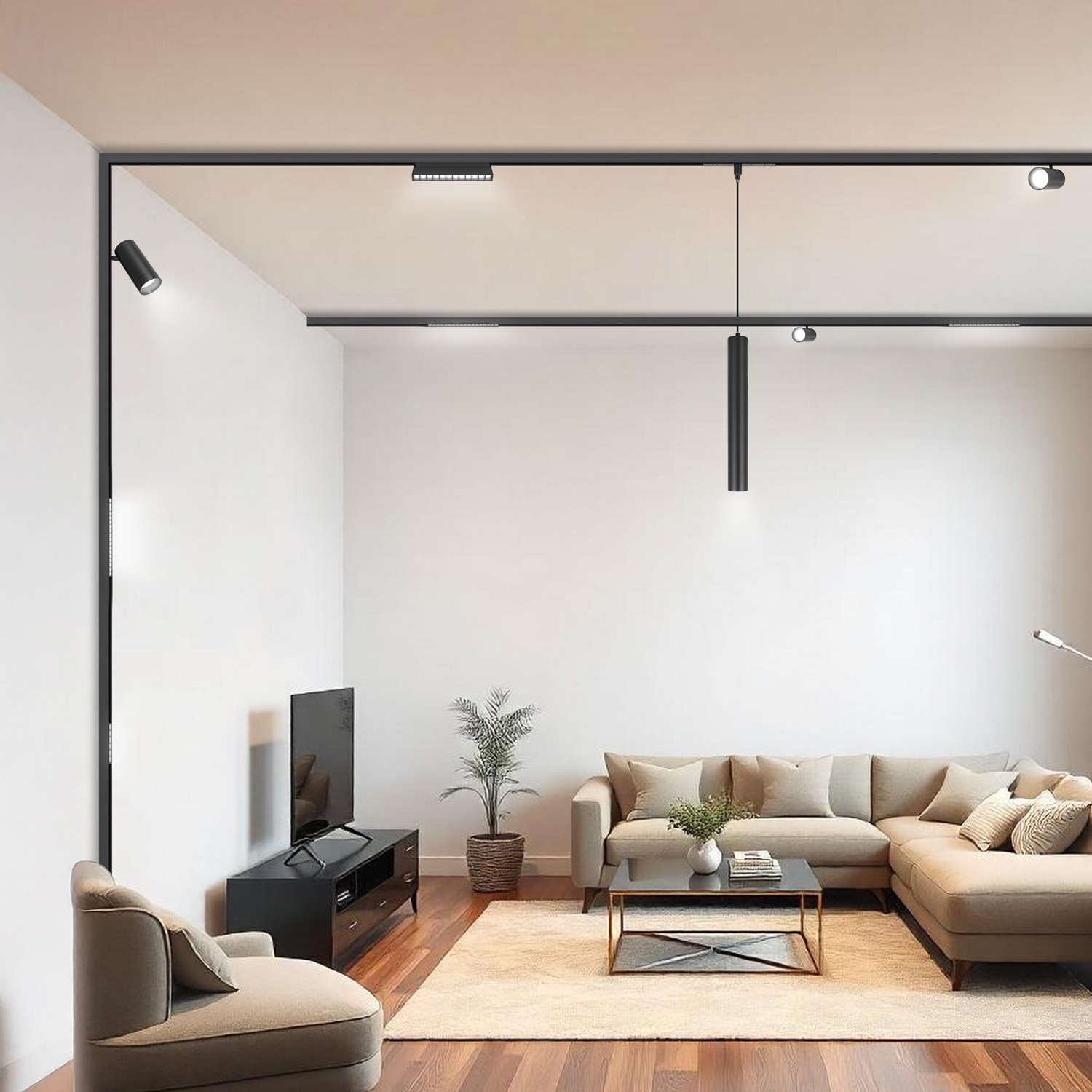 • szyna wpuszczana (podtynkowa) – montowana w suficie podwieszanym, daje elegancki, minimalistyczny efekt,