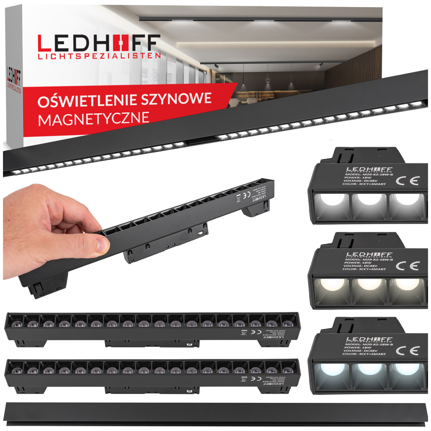 System oświetlenia szynowego magnetycznego marki LEDHOFF to połączenie maksymalnej efektywności (pełna elastyczność aranżacji, barwy i kierunku światła) i wyrafinowanej estetyki - wąskie, subtelne linie z wykończeniem w kolorze czarny mat to mocny akcent dekoracyjny, który z łatwością dopasuje się do każdego wnętrza.