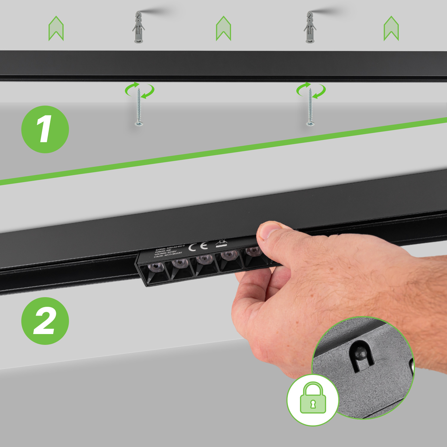 Klasyczny montaż natynkowy jest bardzo prosty – szynę należy przymocować do wybranej powierzchni - ściany lub sufitu, a następnie podpiąć do niej wybrany zasilacz. Lampa posiada magnetyczne zaczepy oraz złącze 48V - wystarczy przyłożyć ją do szyny magnetycznej LED, a magnesy automatycznie dociągną i zapewnią stabilne połączenie. Nie wymaga wkrętów ani dodatkowych uchwytów.