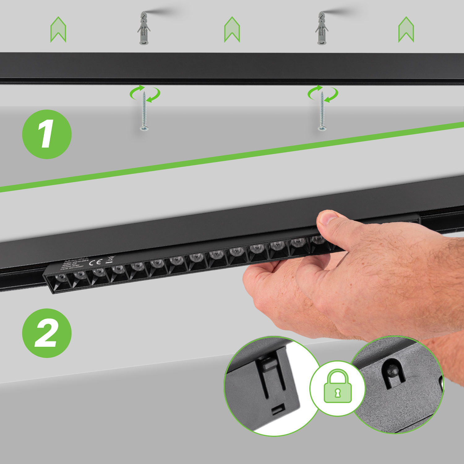 Klasyczny montaż natynkowy jest bardzo prosty – szynę należy przymocować do wybranej powierzchni - ściany lub sufitu, a następnie podpiąć do niej wybrany zasilacz. Lampa posiada magnetyczne zaczepy oraz złącze 48V - wystarczy przyłożyć ją do szyny magnetycznej LED, a magnesy automatycznie dociągną i zapewnią stabilne połączenie. Nie wymaga wkrętów ani dodatkowych uchwytów.