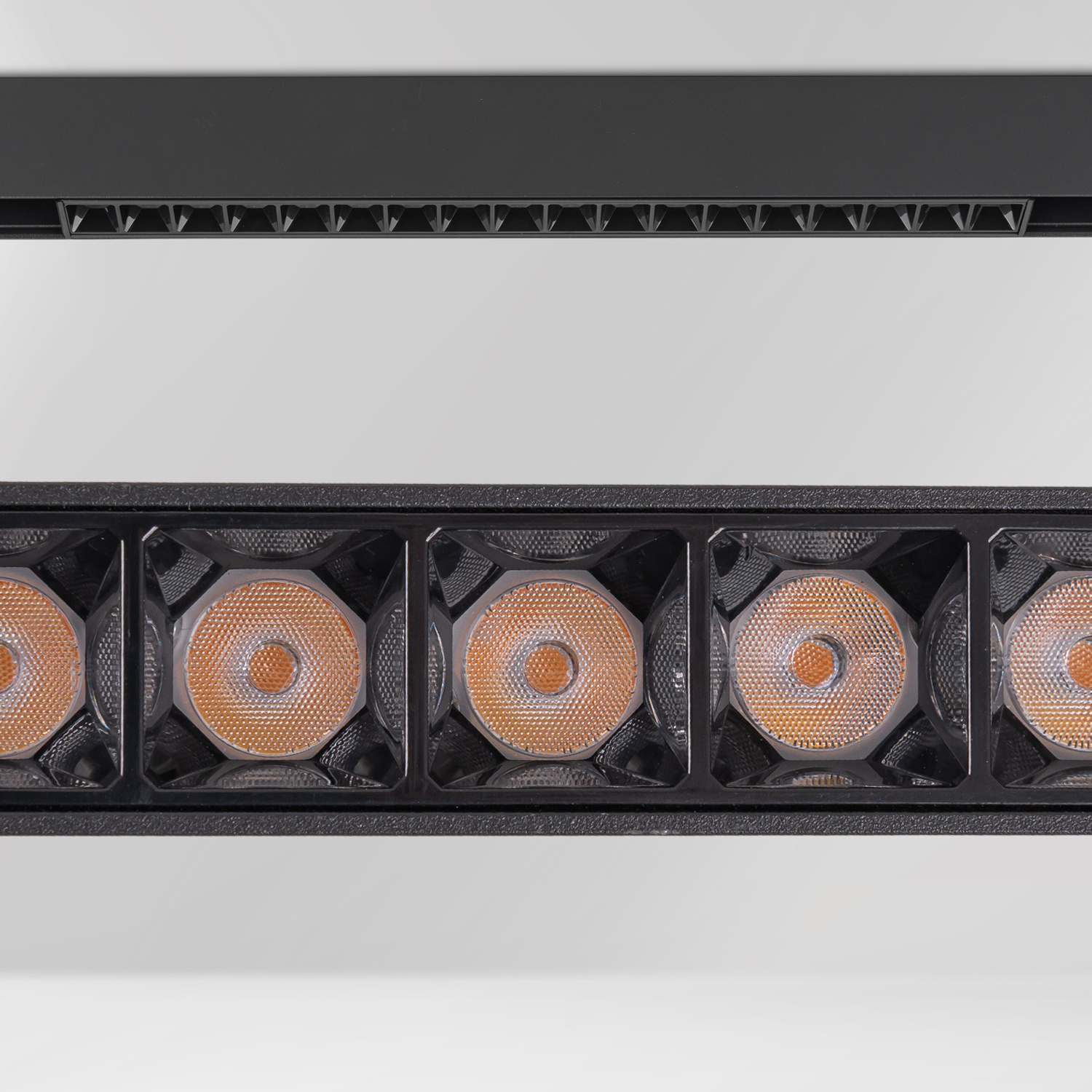 System szynowy magnetyczny pozwala stworzyć elastyczny, rozbudowany układ oświetleniowy, a czarne, matowe wykończenie wszystkich składających się na niego elementów dodaje mu elegancji i ponadczasowego charakteru.