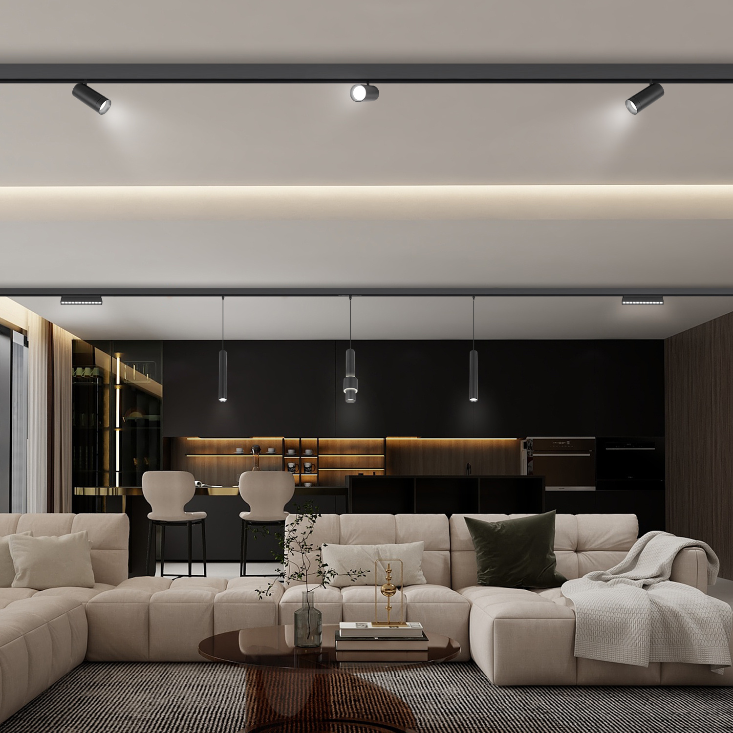 System szynowy magnetyczny pozwala stworzyć elastyczny, rozbudowany układ oświetleniowy, a czarne, matowe wykończenie wszystkich składających się na niego elementów dodaje mu elegancji i ponadczasowego charakteru.