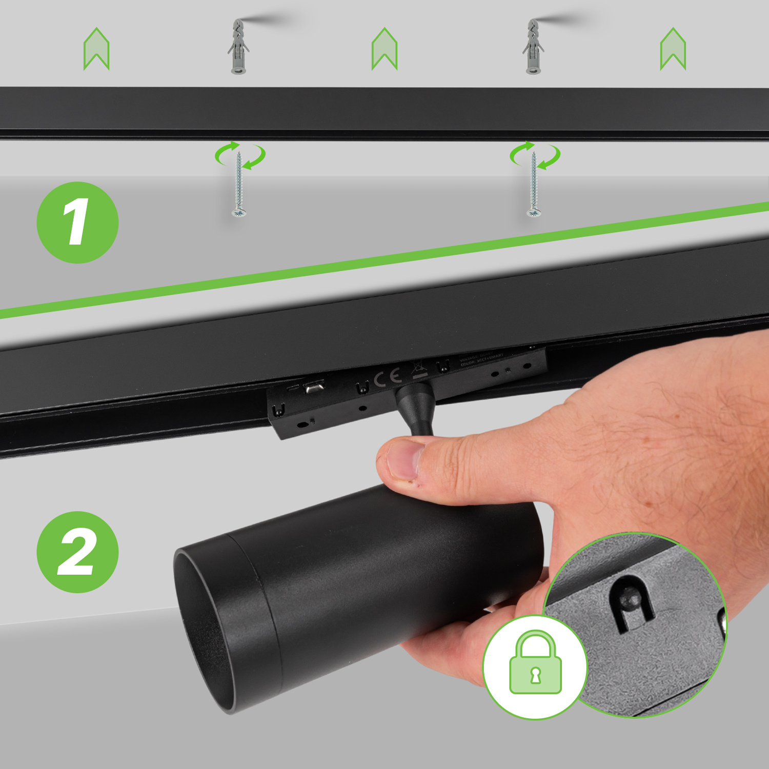 Klasyczny montaż natynkowy jest bardzo prosty – szynę należy przymocować do wybranej powierzchni - ściany lub sufitu, a następnie podpiąć do niej wybrany zasilacz. Lampa posiada magnetyczne zaczepy oraz złącze 48V - wystarczy przyłożyć ją do szyny magnetycznej LED, a magnesy automatycznie dociągną i zapewnią stabilne połączenie. Nie wymaga wkrętów ani dodatkowych uchwytów.